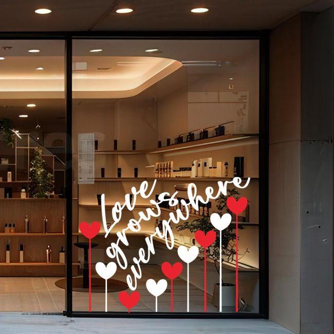 Αυτοκόλλητο στολισμού βιτρίνας για τη γιορτή του Αγίου Βαλεντίνου. Ένα ελκυστικό σχέδιο για μοναδική διακόσμηση της βιτρίνας σας. Ανακαλύψτε περισσότερα σχέδια και ιδέες για τη δημιουργία μιας εντυπωσιακής βιτρίνας για την ημέρα των ερωτευμένων.