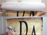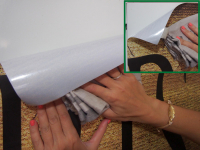 6) Τραβήξτε κάτω το πίσω χαρτί και ταυτόχρονα πιέστε το αυτοκόλλητο με το ύφασμα. Είναι πολύ έυκολο αλλά καλό θα είναι να έχετε βοήθεια στο "τράβηγμα" του χαρτιού