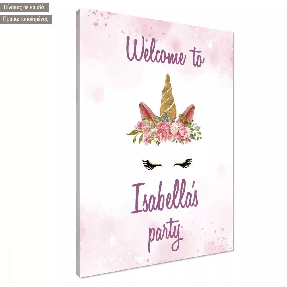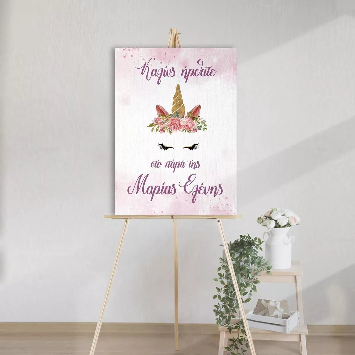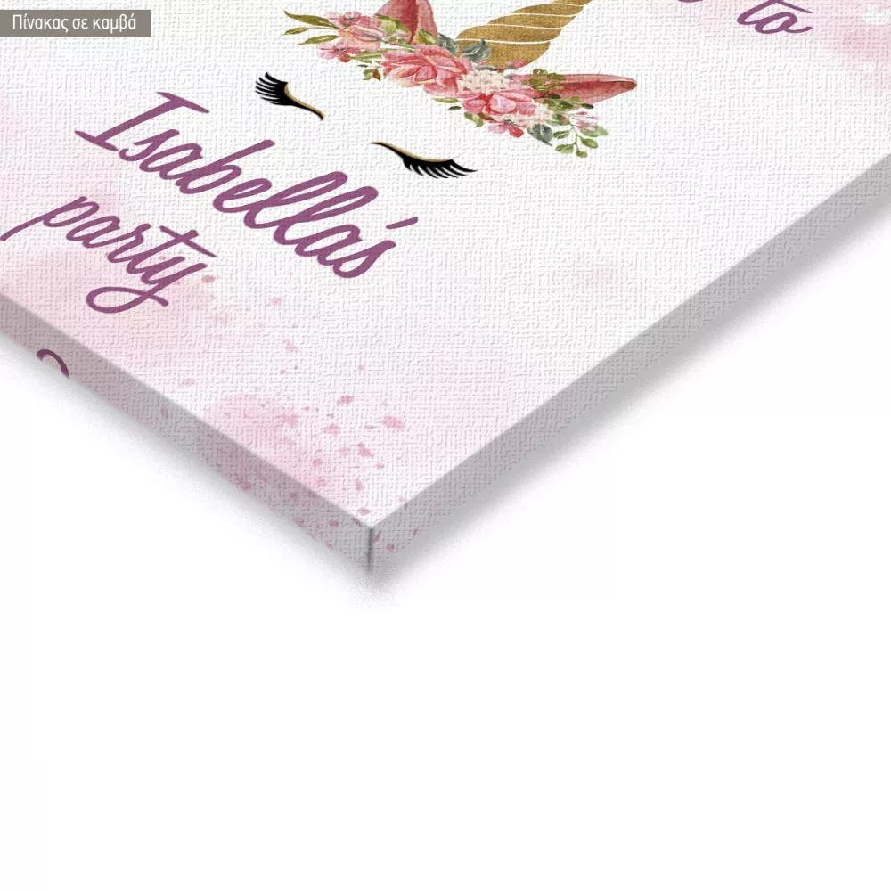 Πίνακας υποδοχής πάρτι γενεθλίων, Μονόκερος, κοντινό. Διαθέσιμο και σε κάδρο μαύρη κορνίζα, λευκή κορνίζα, ξύλινη κορνίζα, αφίσα, πόστερ