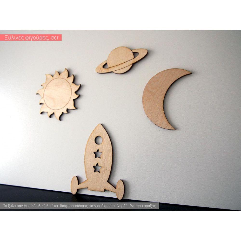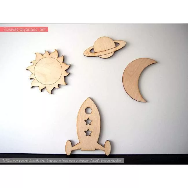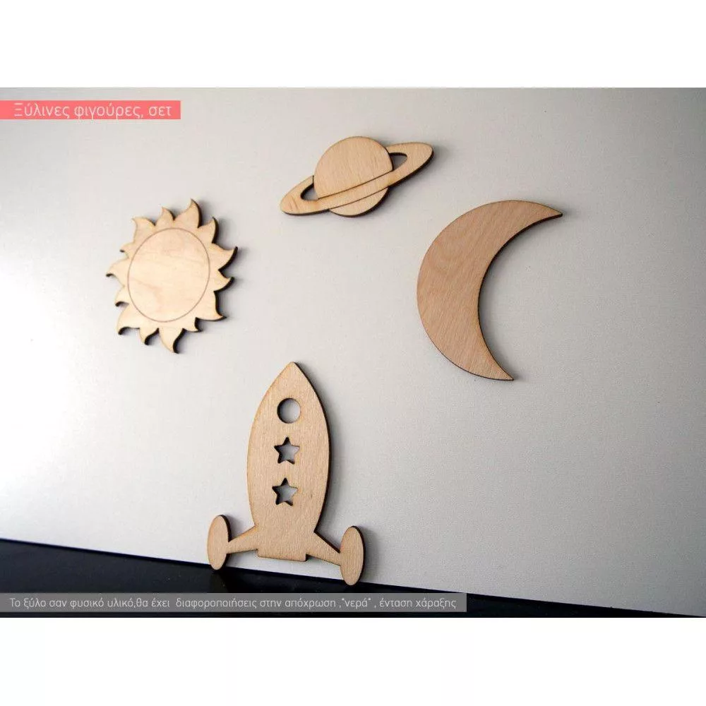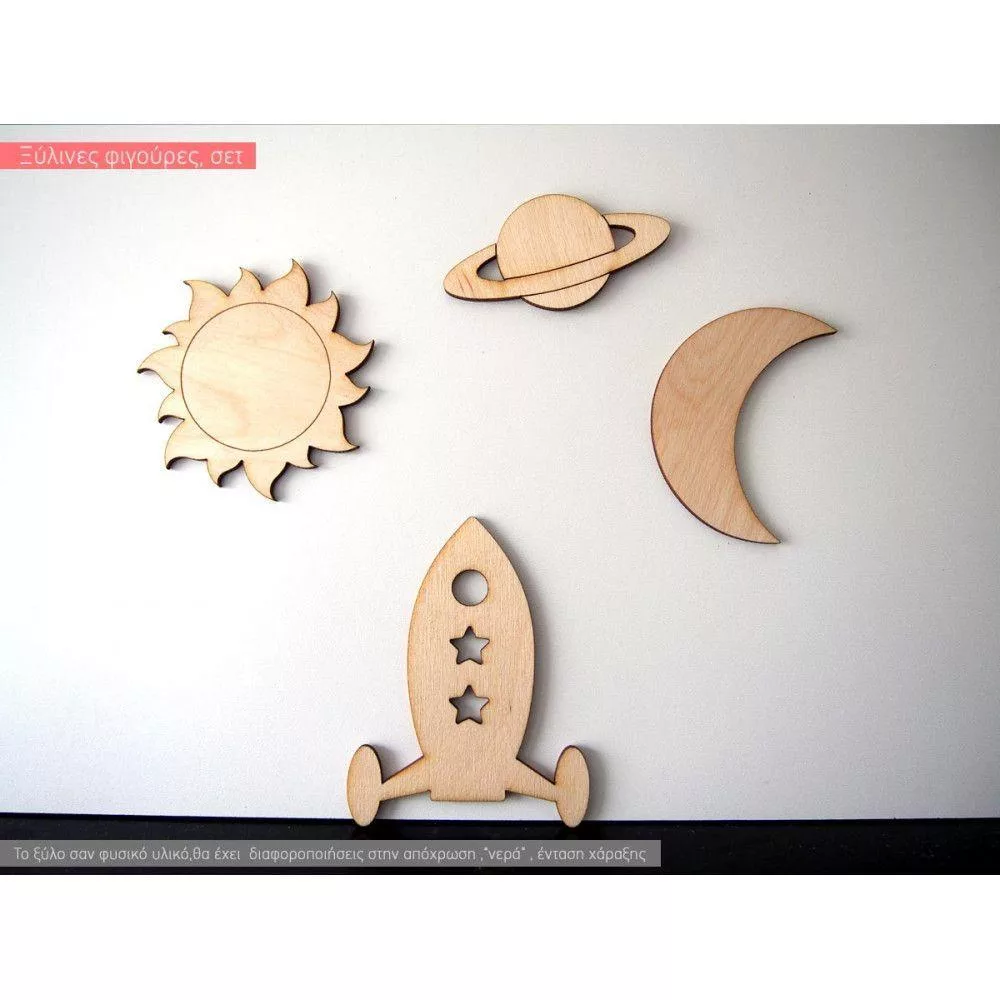 Ξύλινα Πύραυλος ήλιος, κρόνος, φεγγάρι, σετ 4 τμχ, διακοσμητικές φιγούρες