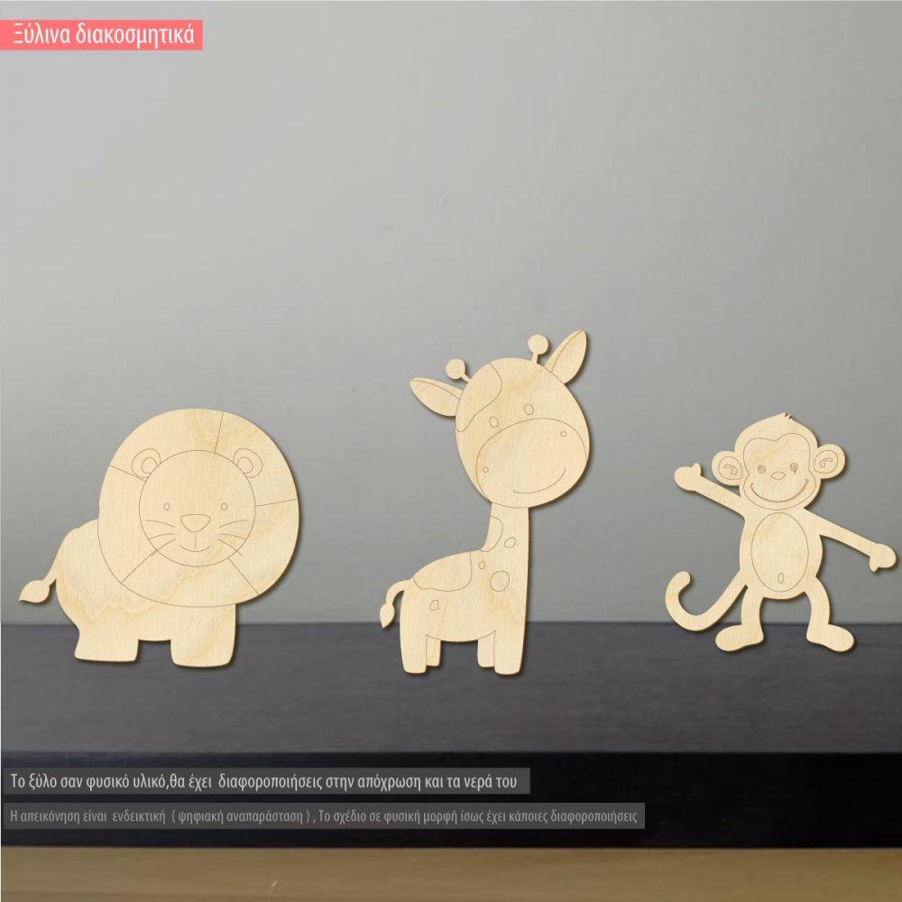 Ξύλινα Λιοντάρι καμηλοπάρδαλη, μαϊμουδάκι σετ 3 τμχ, διακοσμητικές φιγούρα