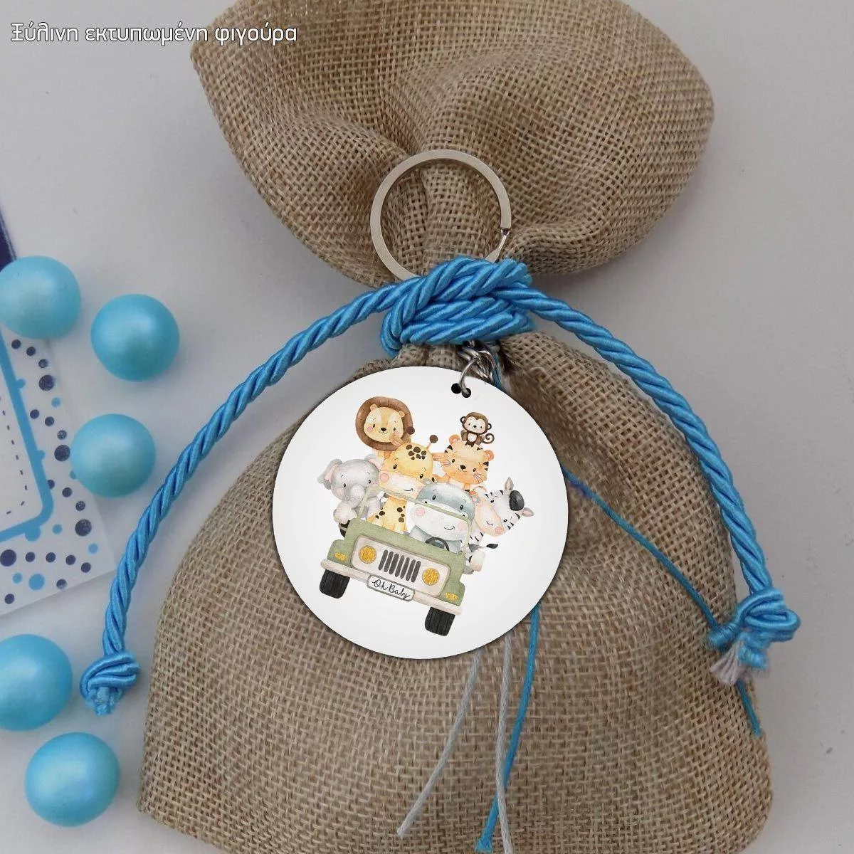 Παρέα ζωάκια σε τζιπάκι ζωγραφιστό, ξύλινη φιγούρα εκτυπωμένη