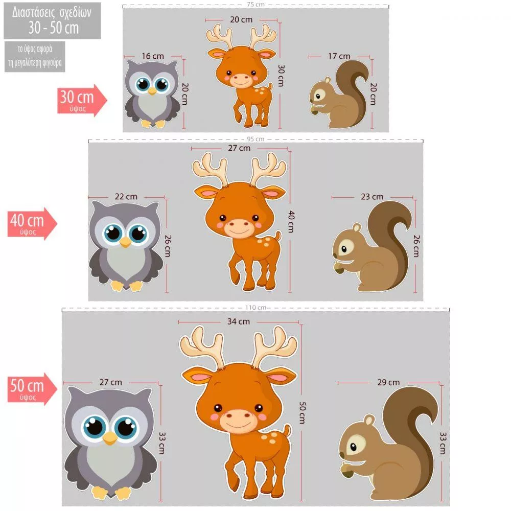 Ζωάκια του δάσους ξύλινες φιγούρες με λουλούδια watercolor, ελάφι, αλεπού, κουκουβάγια