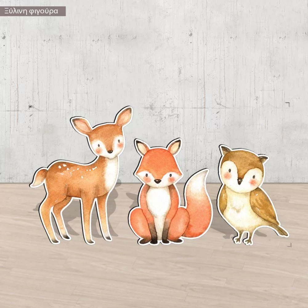Ζωάκια του δάσους ξύλινες φιγούρες με λουλούδια watercolor, ελάφι, αλεπού, κουκουβάγια
