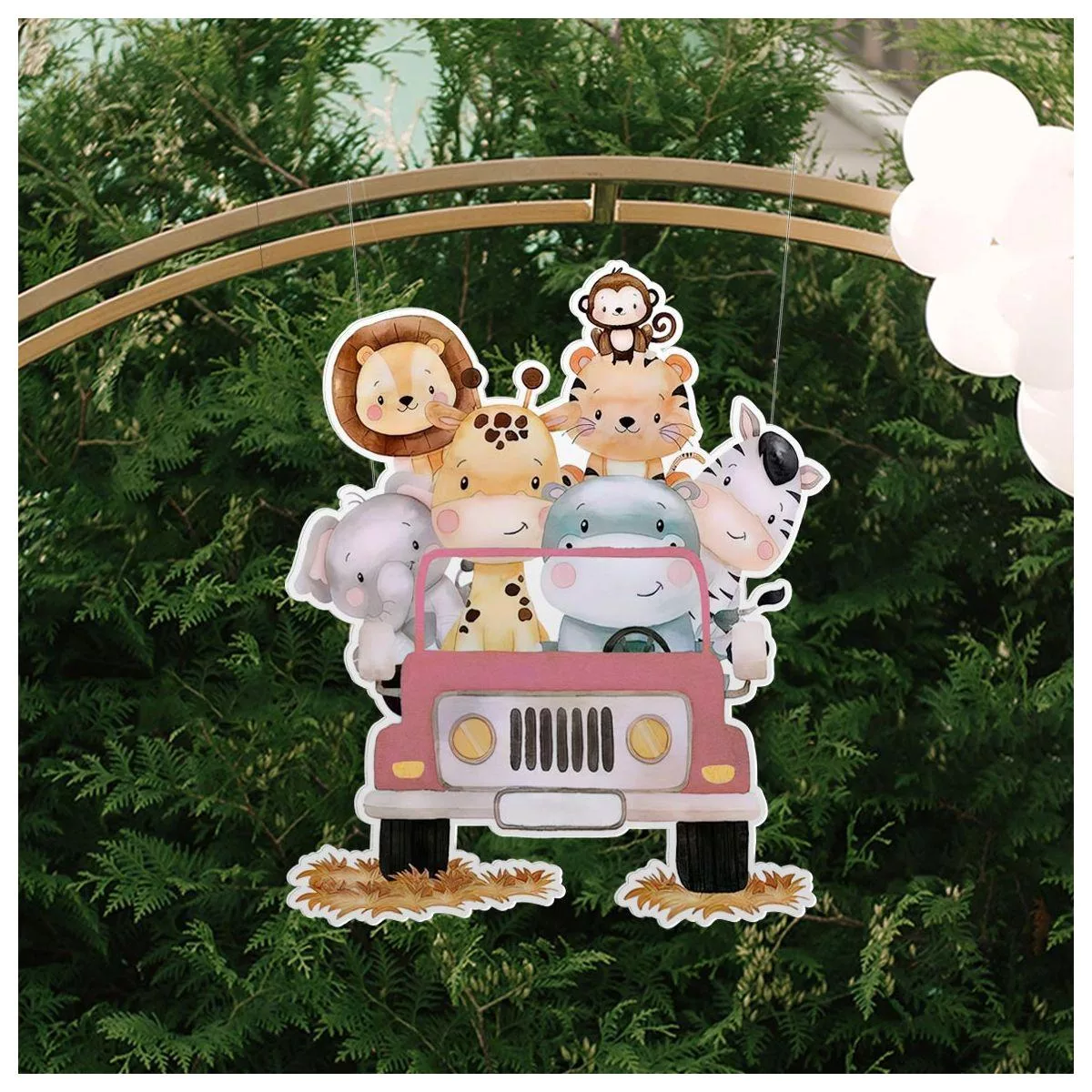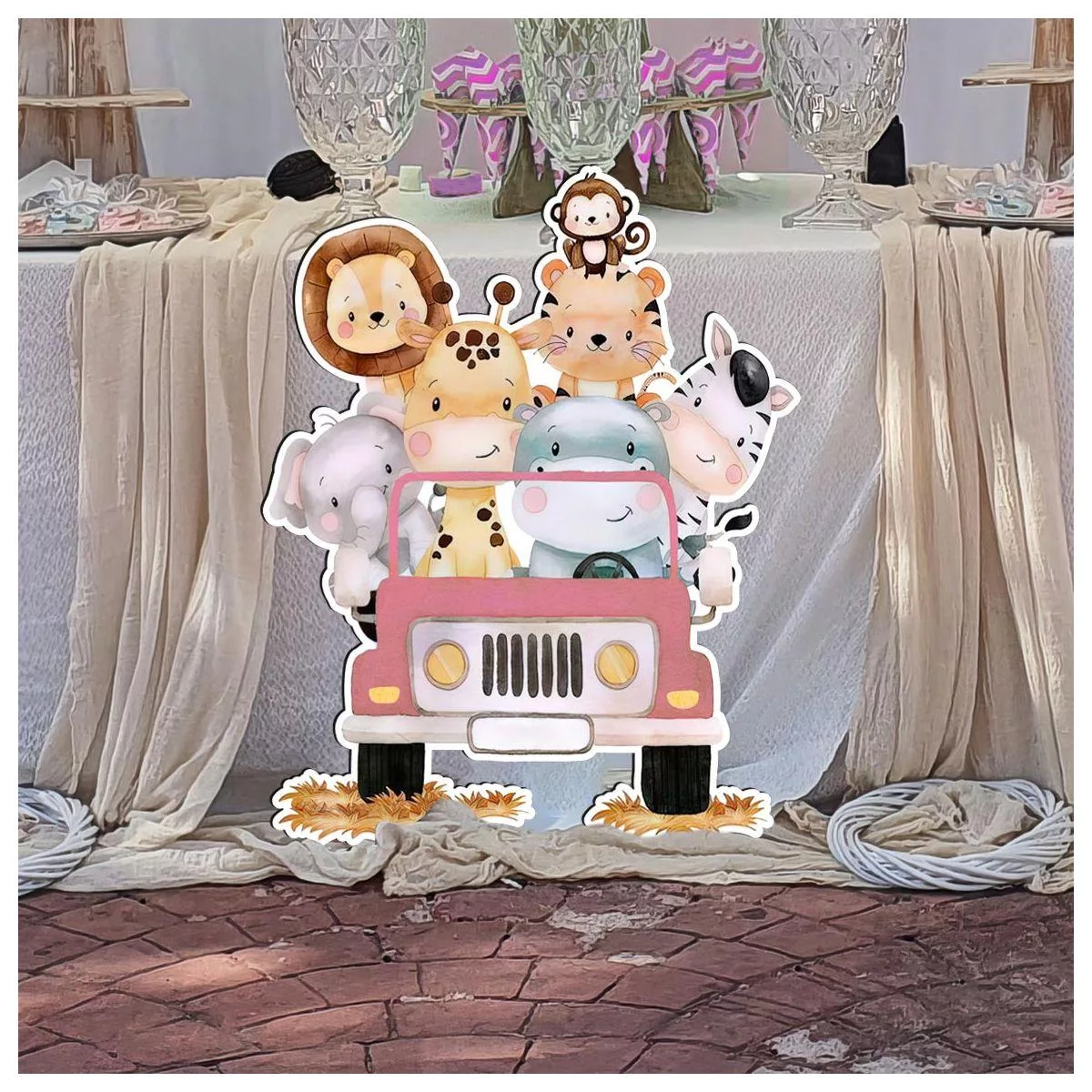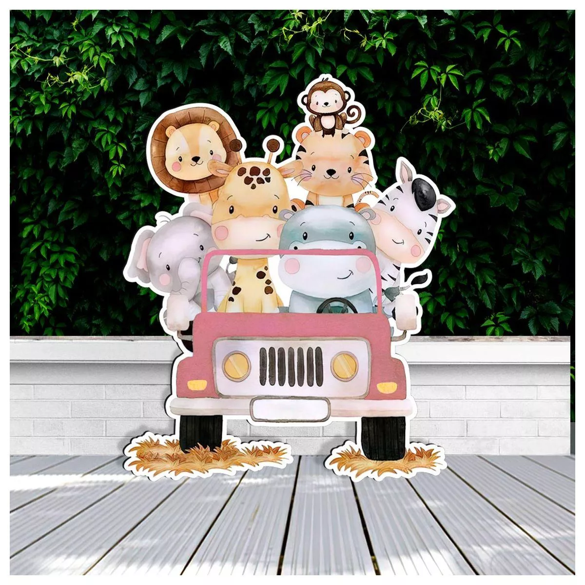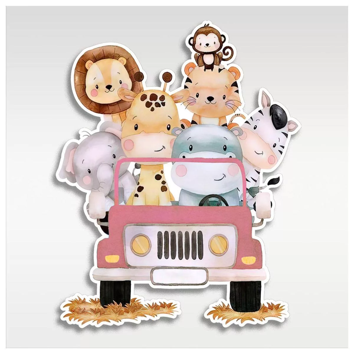 Παρέα ζωάκια σε ροζ τζιπάκι ζωγραφιστό, ξύλινη φιγούρα εκτυπωμένη