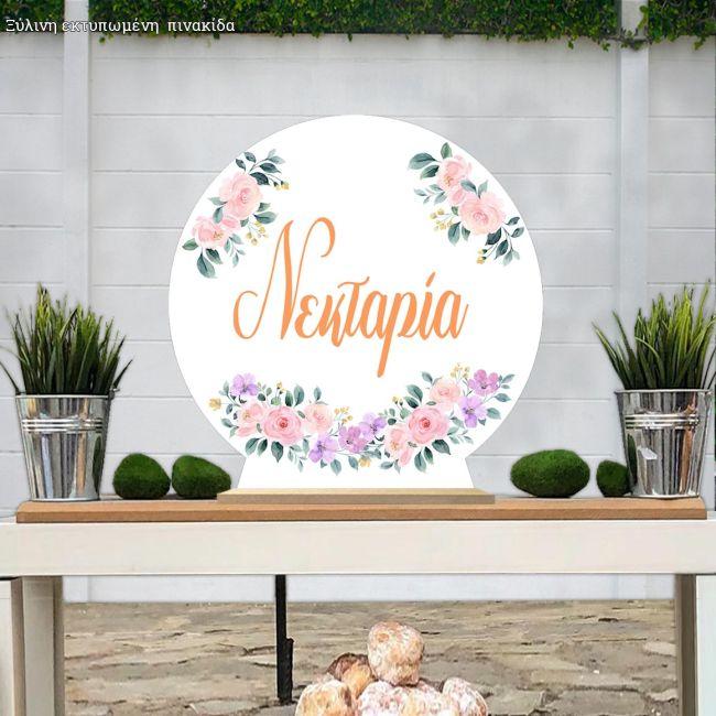 Ξύλινη πινακίδα, Λουλούδια ζωγραφιστά, ροζ μοβ αποχρώσεις