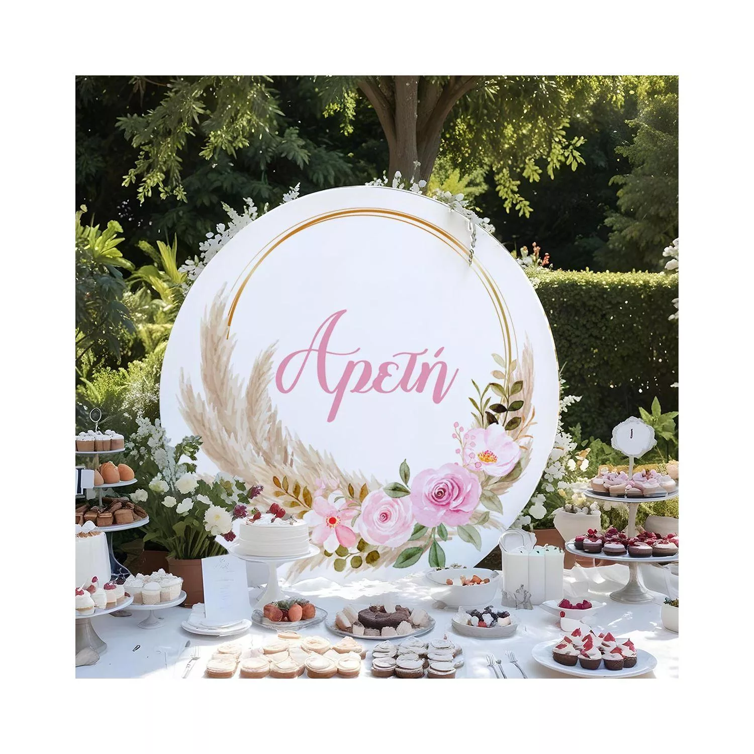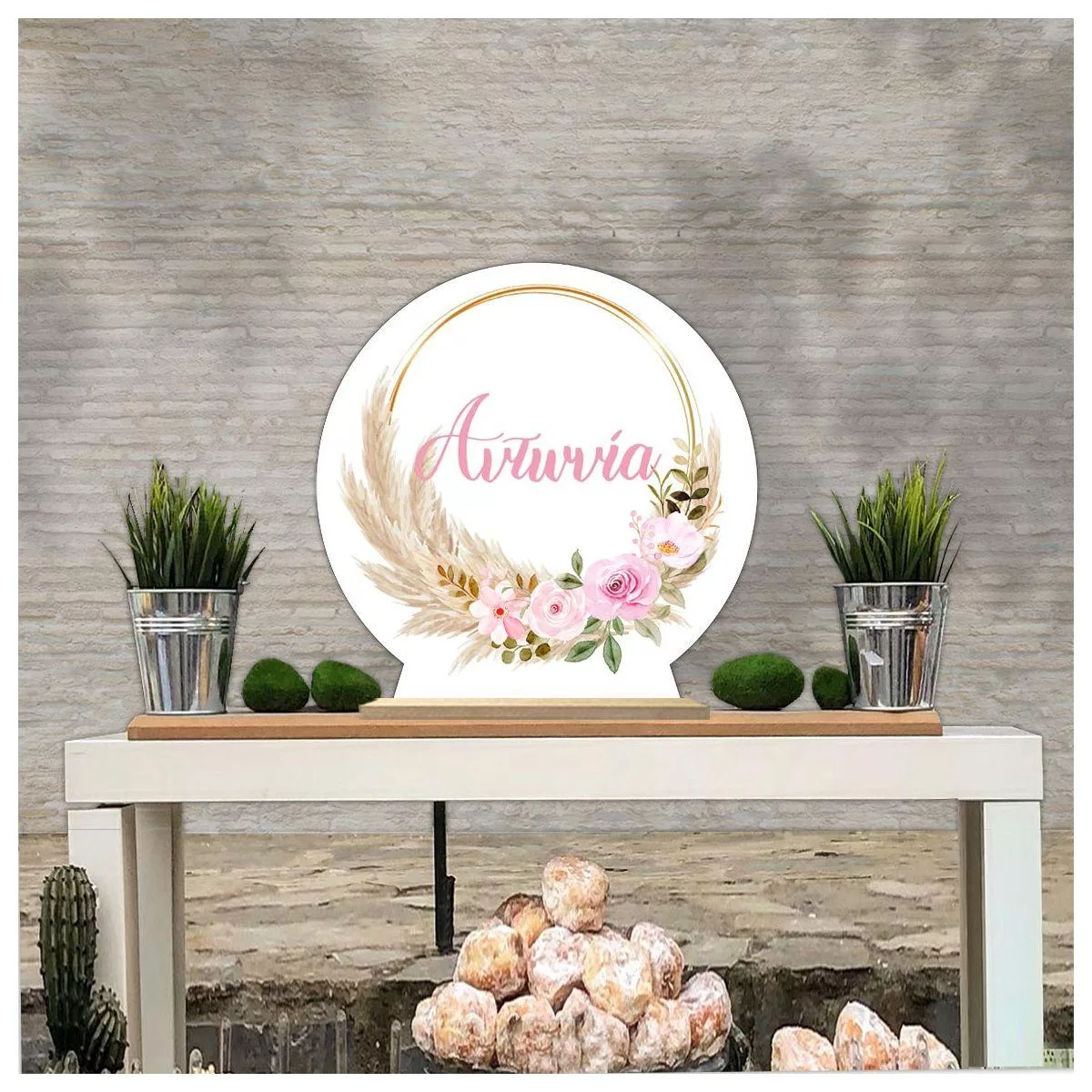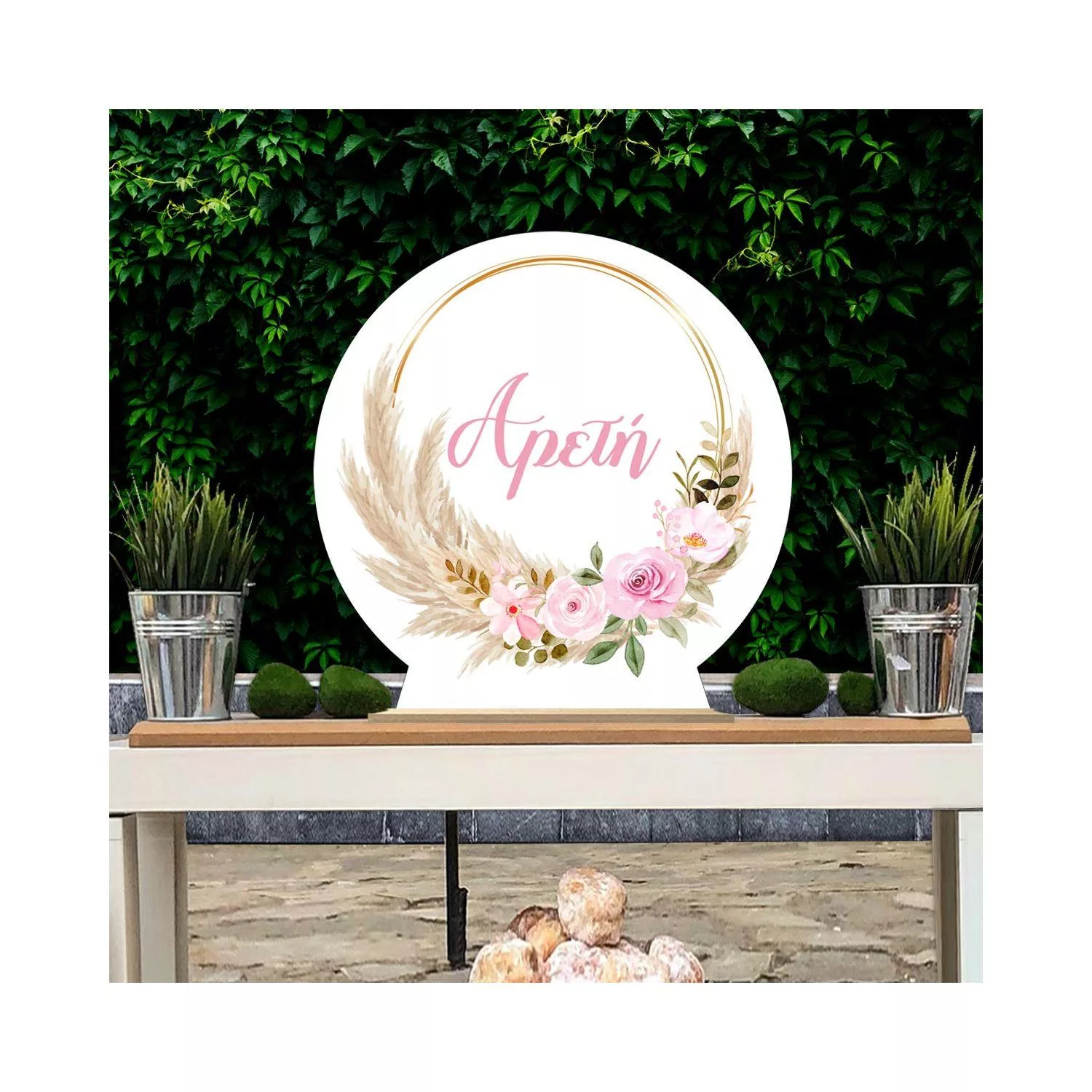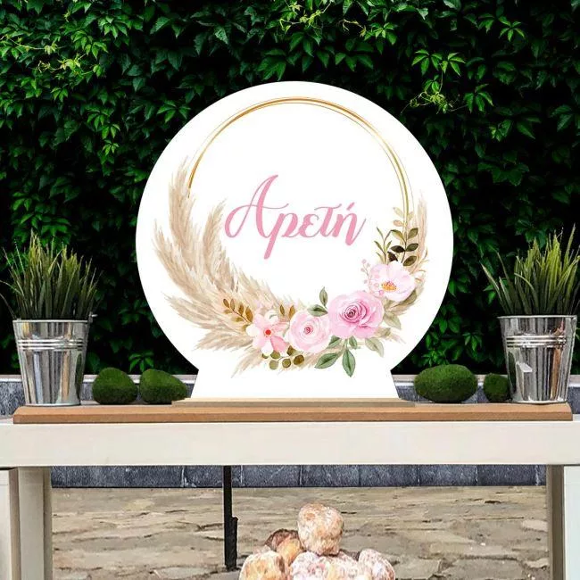 Ξύλινη πινακίδα, pampas grass and pink flowers