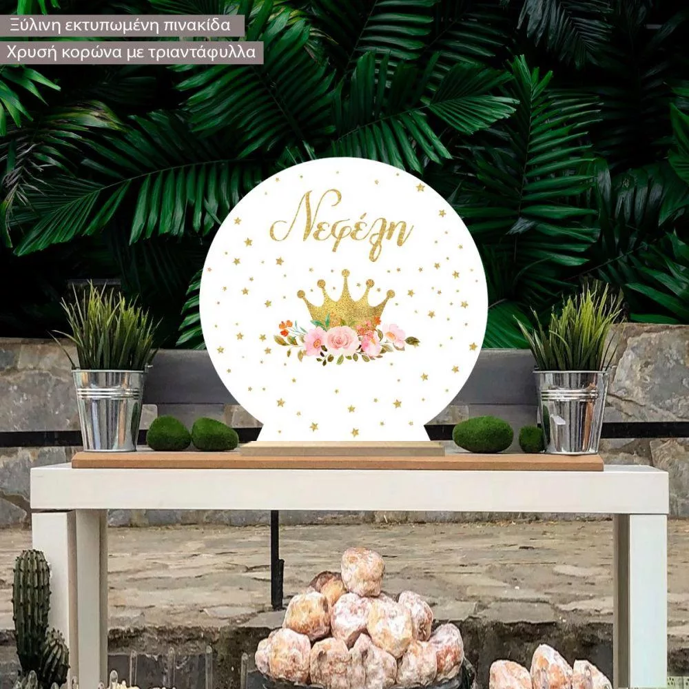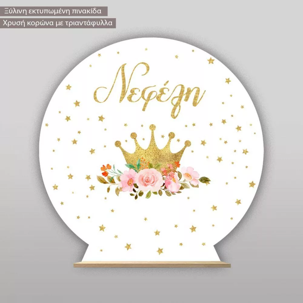 Ξύλινη πινακίδα, Χρυσή κορώνα με τριαντάφυλλα και αστέρια, προσωποποιημένη