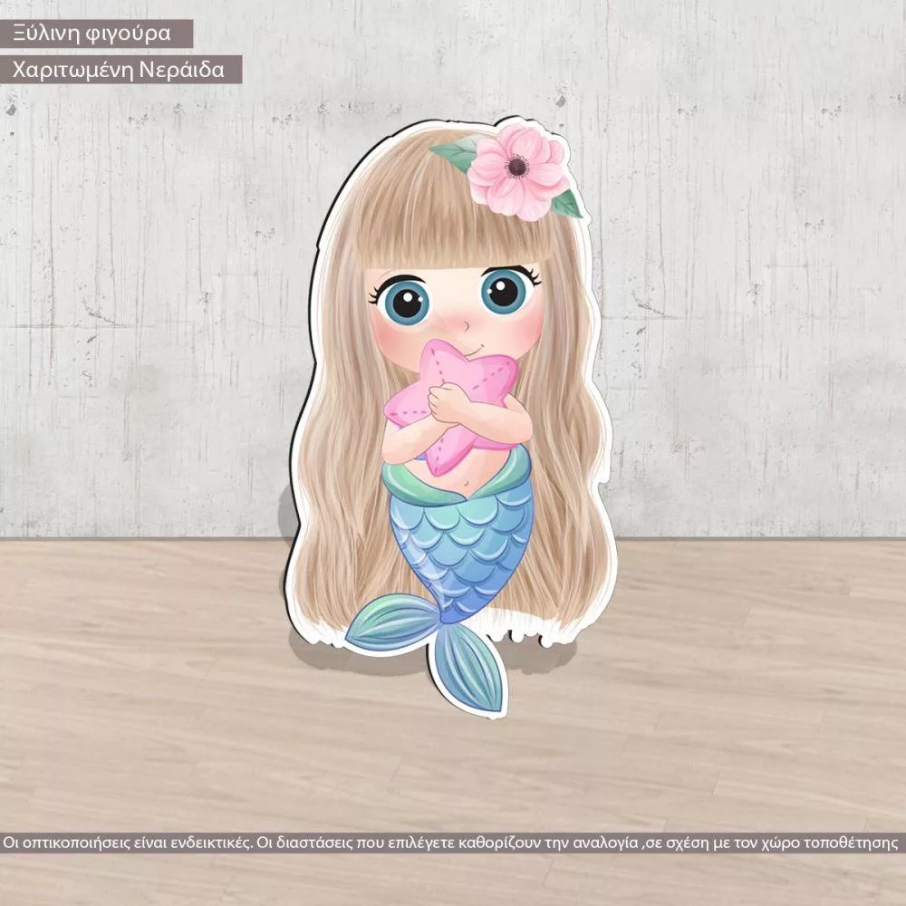Χαριτωμένη γοργόνα με αστέρι, ξύλινη φιγούρα εκτυπωμένη