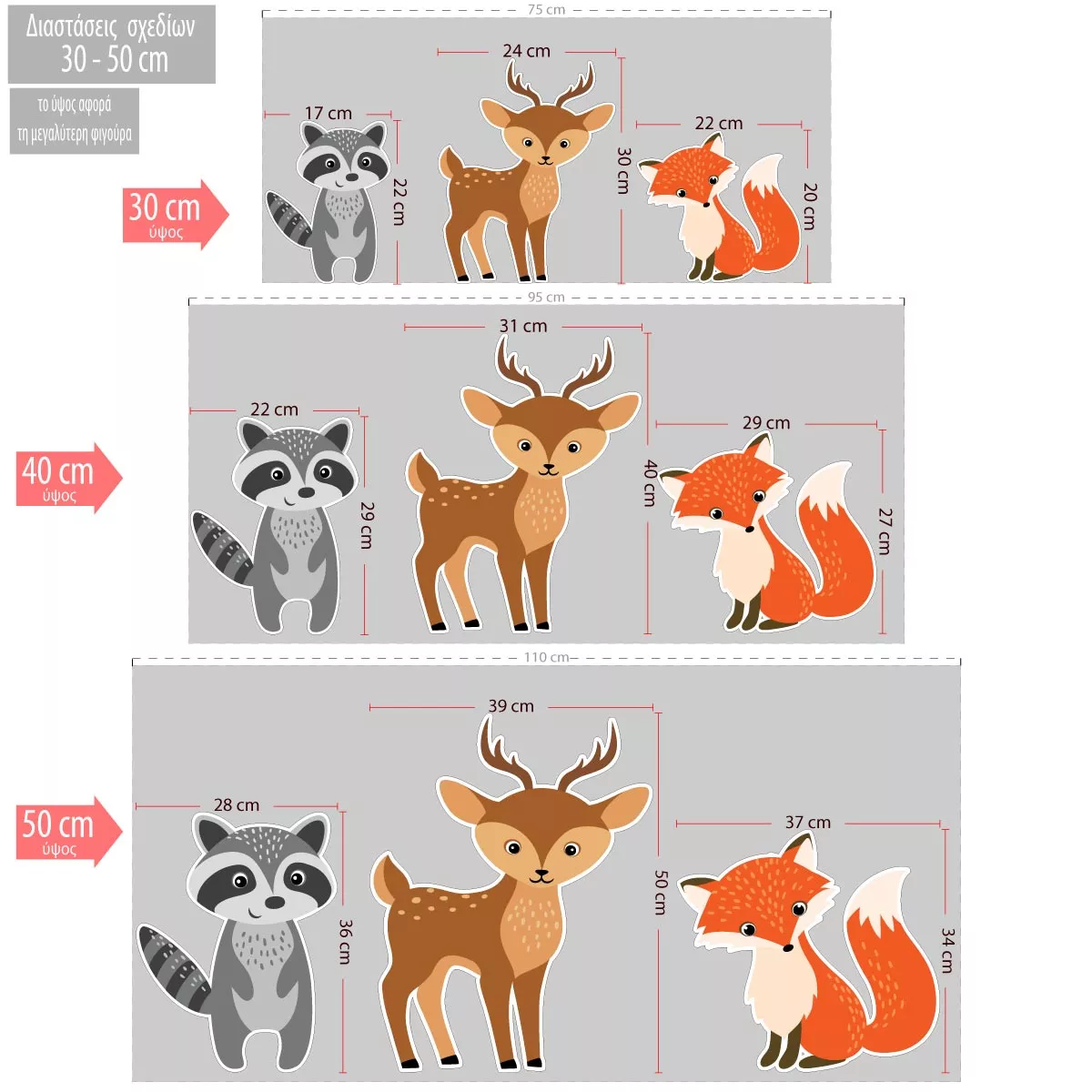 Ζωάκια του δάσους ξύλινες φιγούρες με λουλούδια watercolor, ελάφι, αλεπού, κουκουβάγια