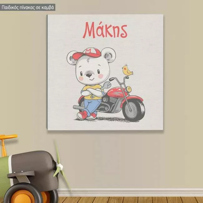 Πίνακας παιδικός σε καμβά Αρκουδάκι με μηχανή και όνομα