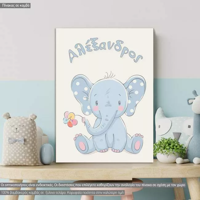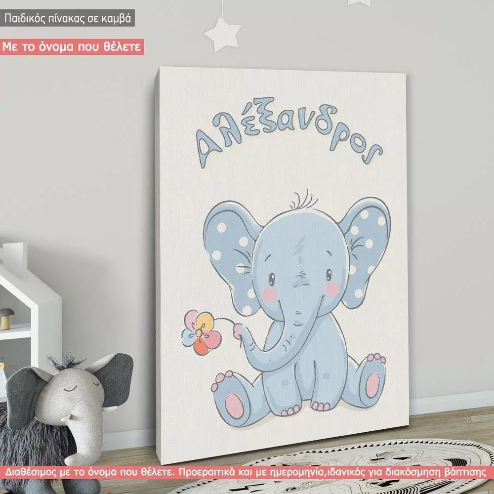 Πίνακας παιδικός σε καμβά Baby elephant, με όνομα