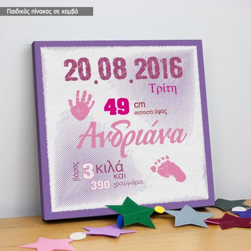 Πίνακας παιδικός σε καμβά Best day ever, με στοιχεία γέννησης για κοριτσια