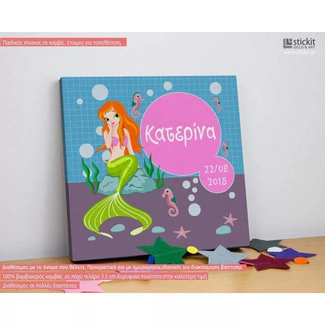 Πίνακας παιδικός σε καμβά Κομψή γοργόνα, με όνομα και ημερομηνία