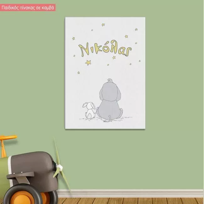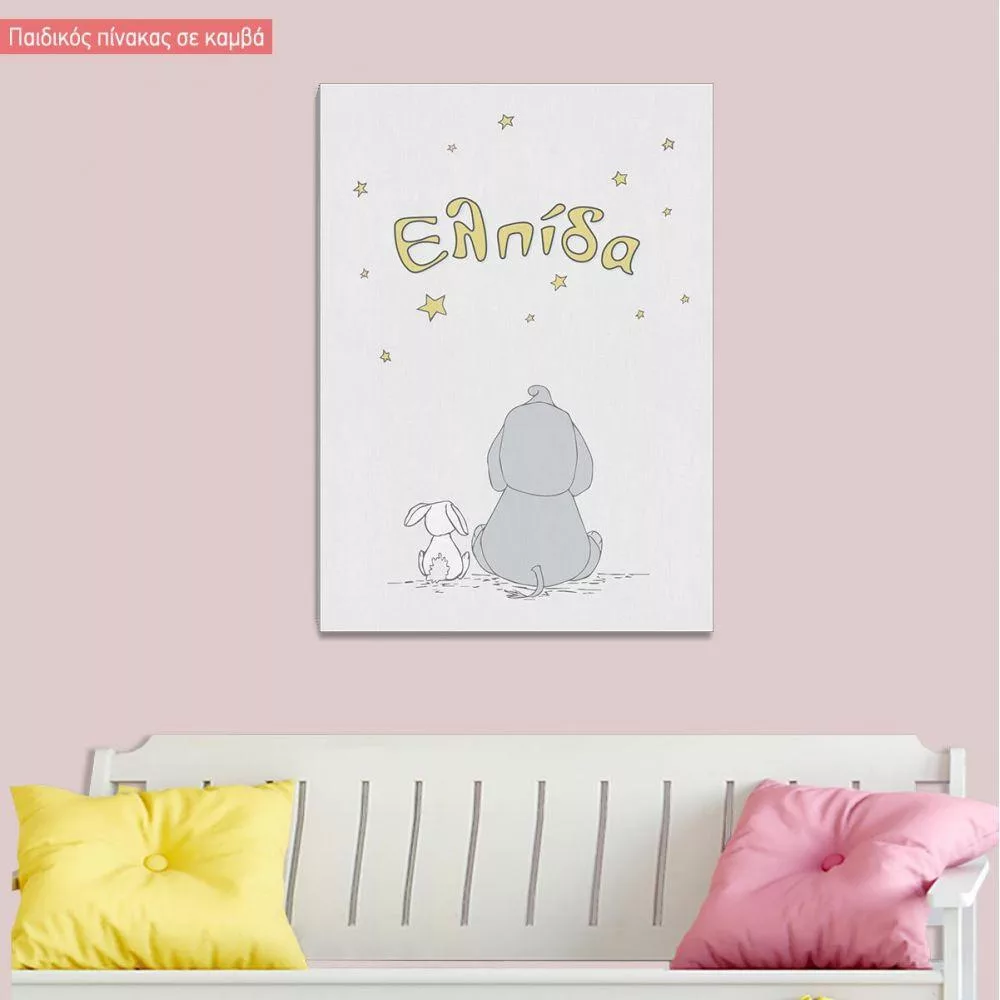 Πίνακας παιδικός σε καμβά Ελεφαντάκι στα σύννεφα, με όνομα