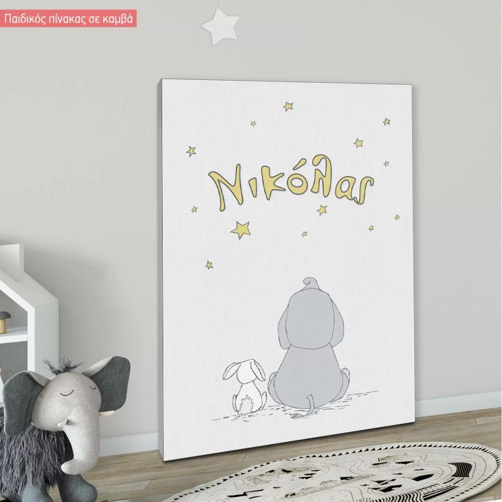 Πίνακας παιδικός σε καμβά Reach for the stars, ελεφαντάκι στα αστέρια με όνομα