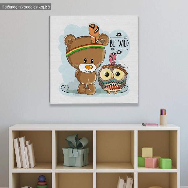 Πίνακας παιδικός σε καμβά Be Wild, Αρκουδάκι και κουκουβάγια tribal