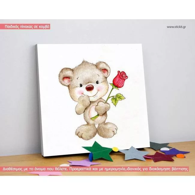 Πίνακας παιδικός σε καμβά Cute teddy bear with red rose