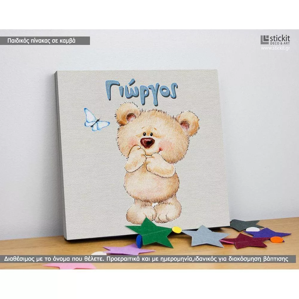 Πίνακας παιδικός σε καμβά Αρκουδάκι και πεταλούδα με όνομα