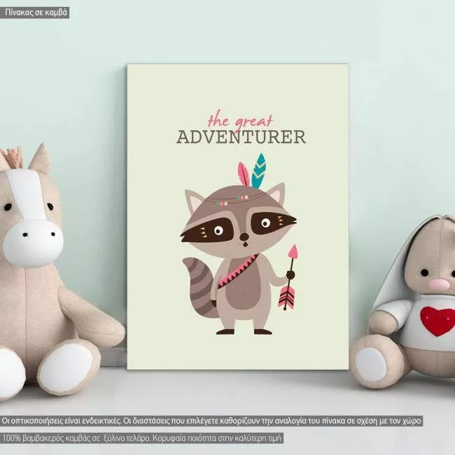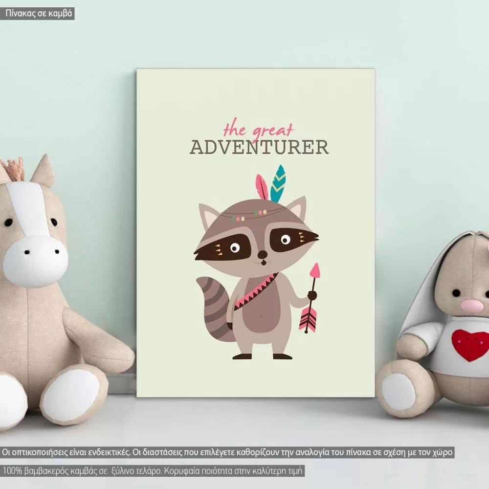Πίνακας παιδικός σε καμβά The great adventurer, με ρακούν