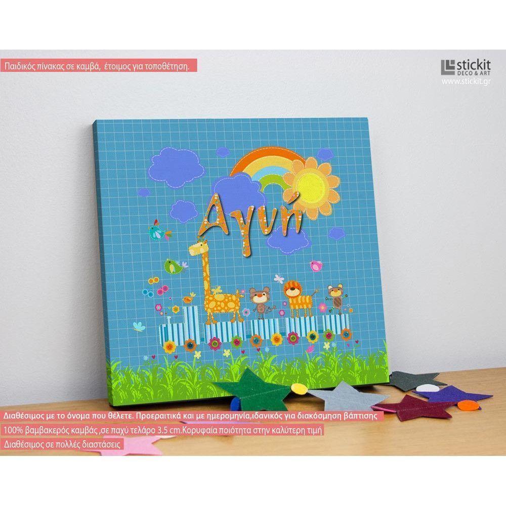 Πίνακας παιδικός σε καμβά Τρενάκι με ζωάκια και όνομα
