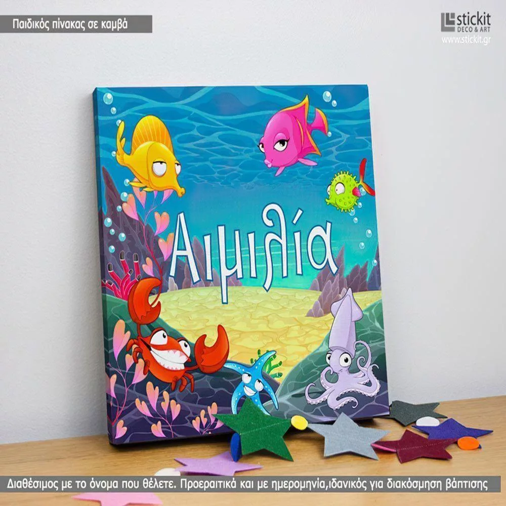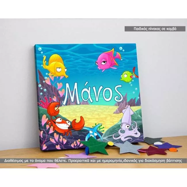 Πίνακας παιδικός σε καμβά Βυθός,με όνομα και ημερομηνία
