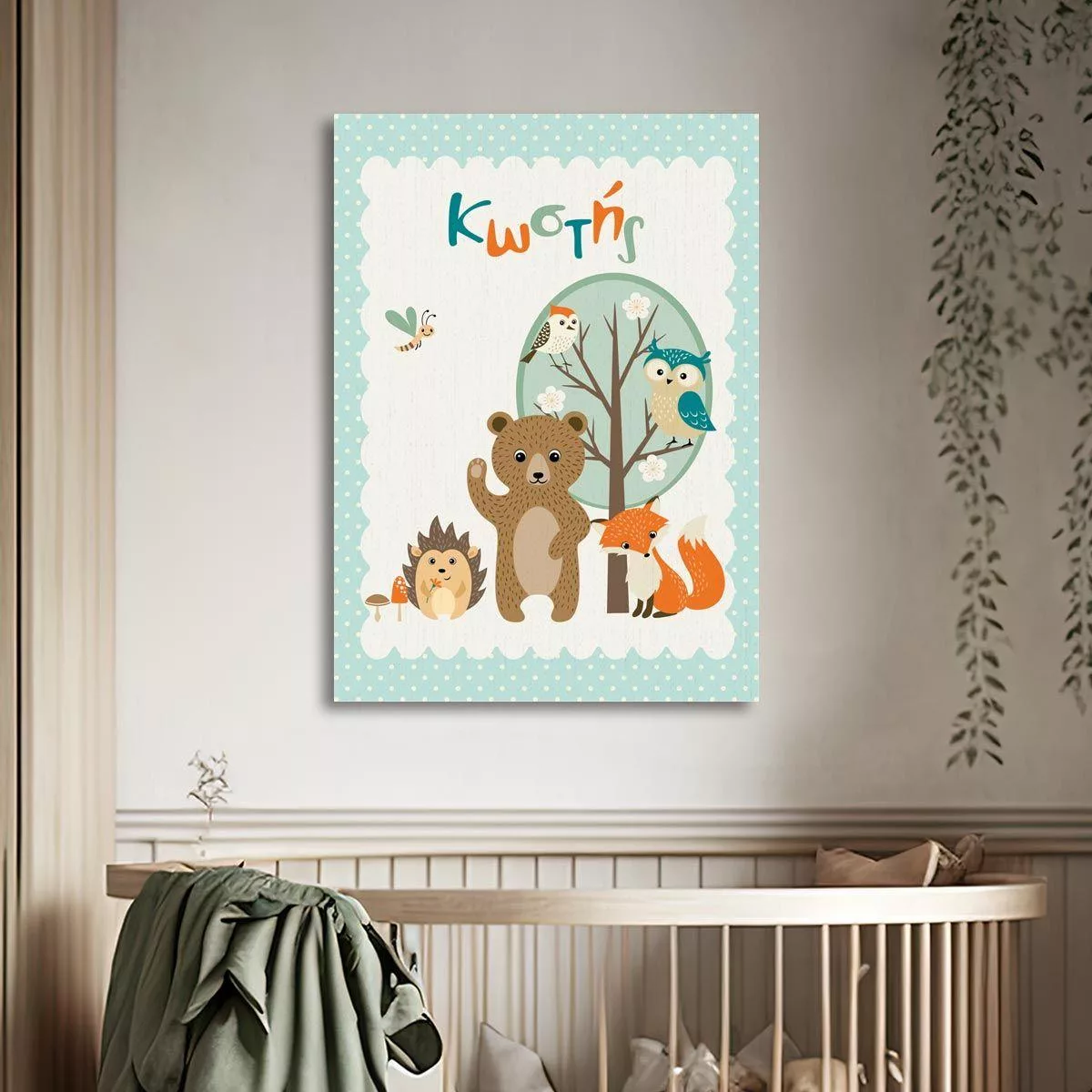 Πίνακας παιδικός σε καμβά Παρέα στο δάσος, ζωάκια και όνομα, τρίπτυχος
