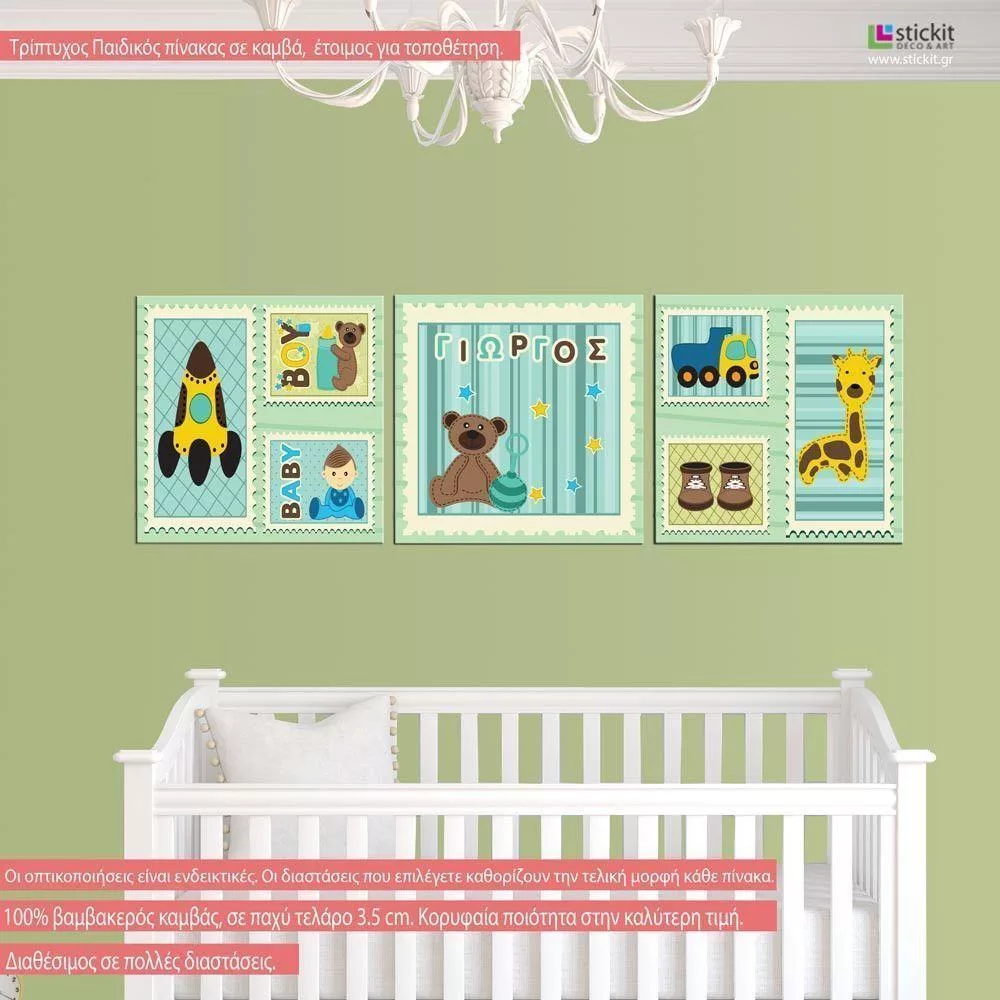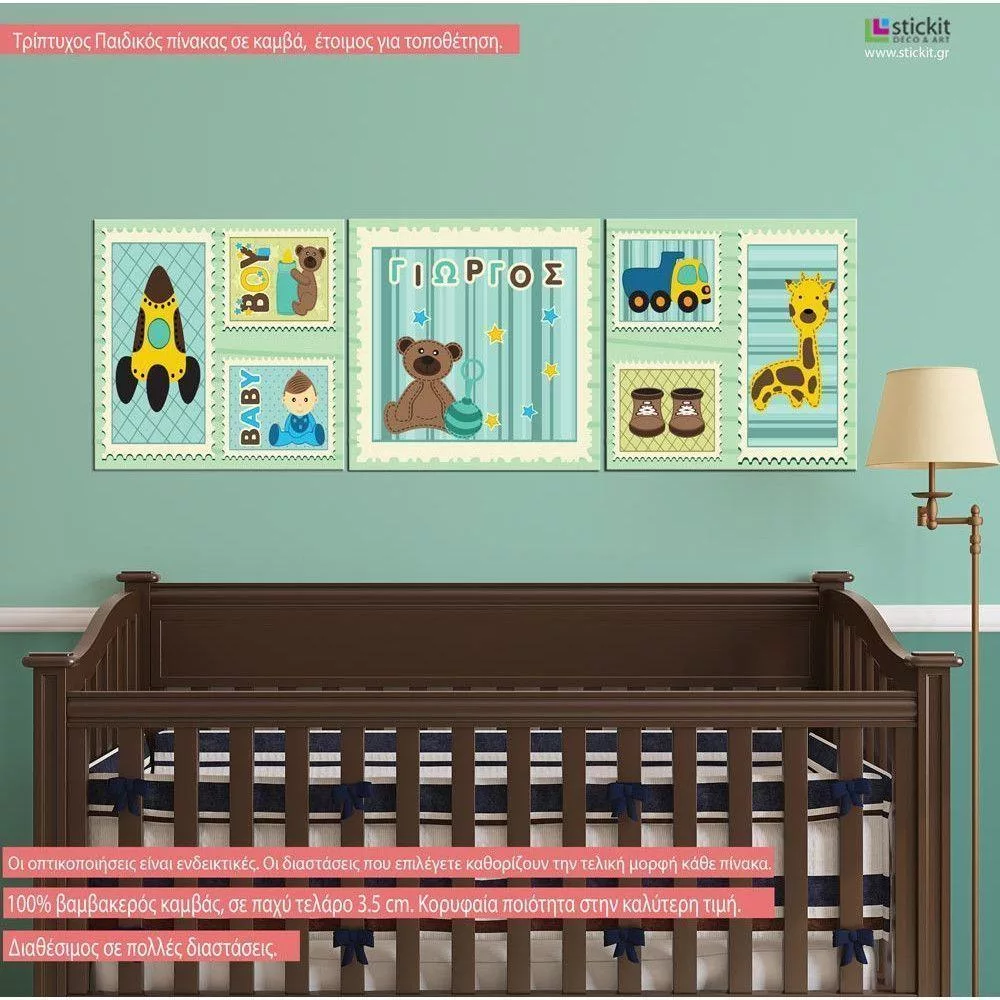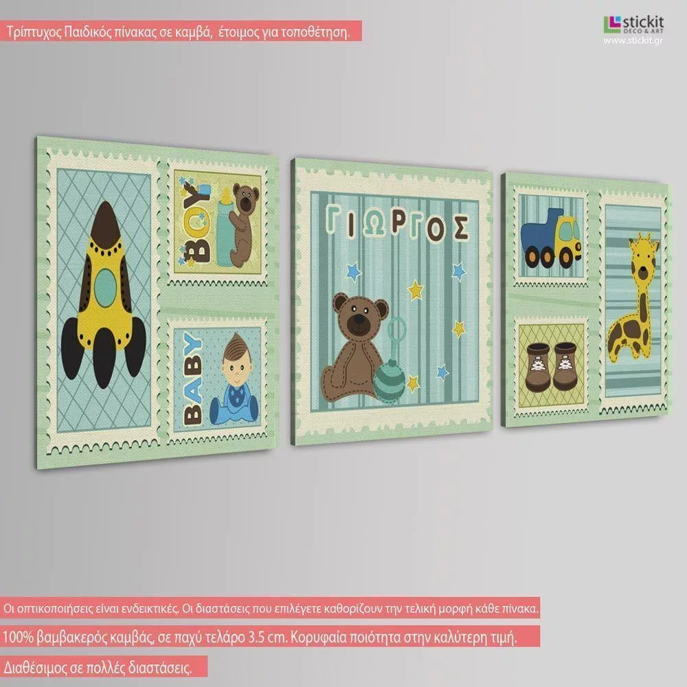 Πίνακας παιδικός σε καμβά Baby boy, με όνομα, τρίπτυχος