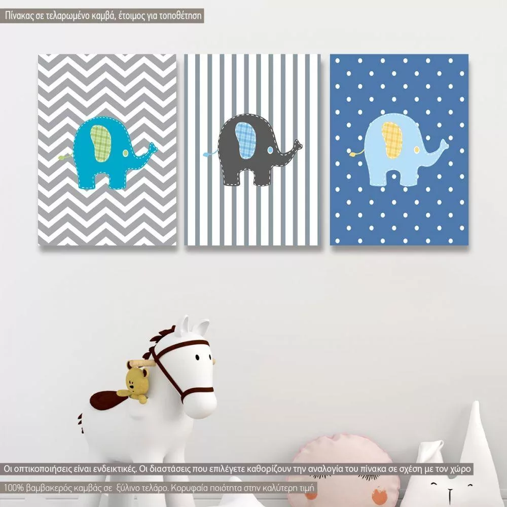 Πίνακας παιδικός σε καμβά Ελεφαντάκια, τρίπτυχος