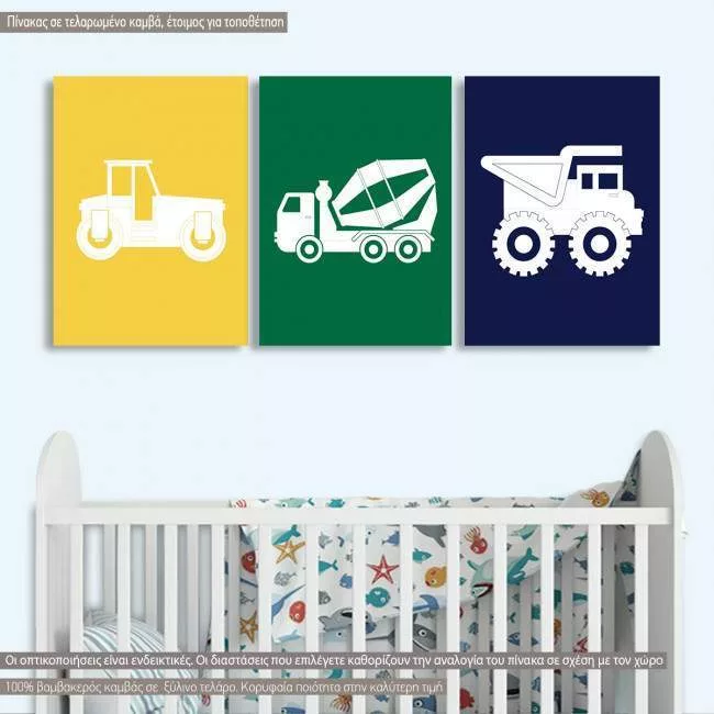 Πίνακας παιδικός σε καμβά Εργοτάξιο ΙΙ, οδοστρωτήρα, μπετονιέρα και φορτηγό, τρίπτυχος