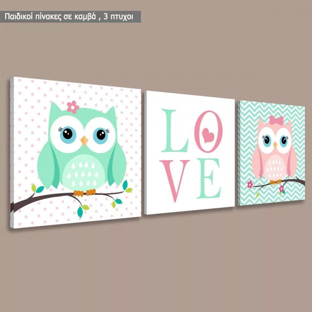 Πίνακας παιδικός σε καμβά Κουκουβάγιες girly love, τρίπτυχος