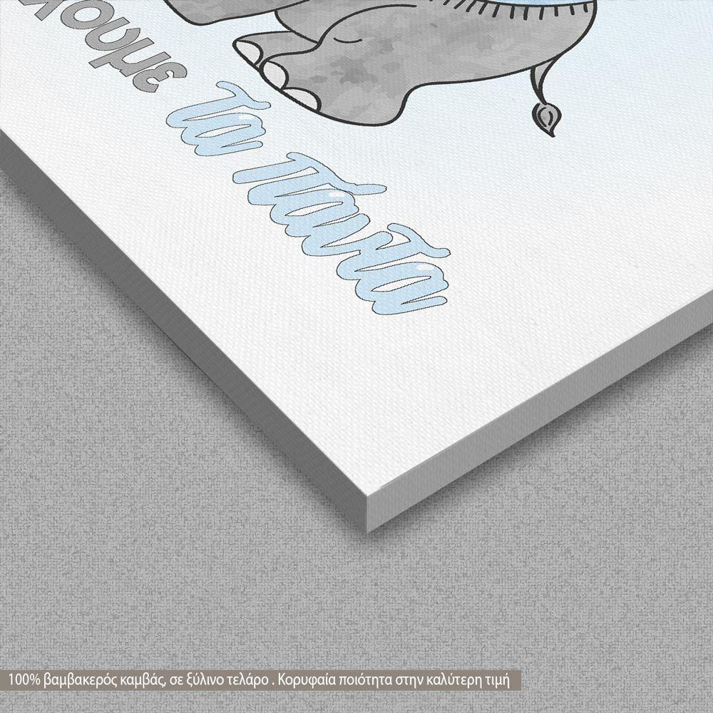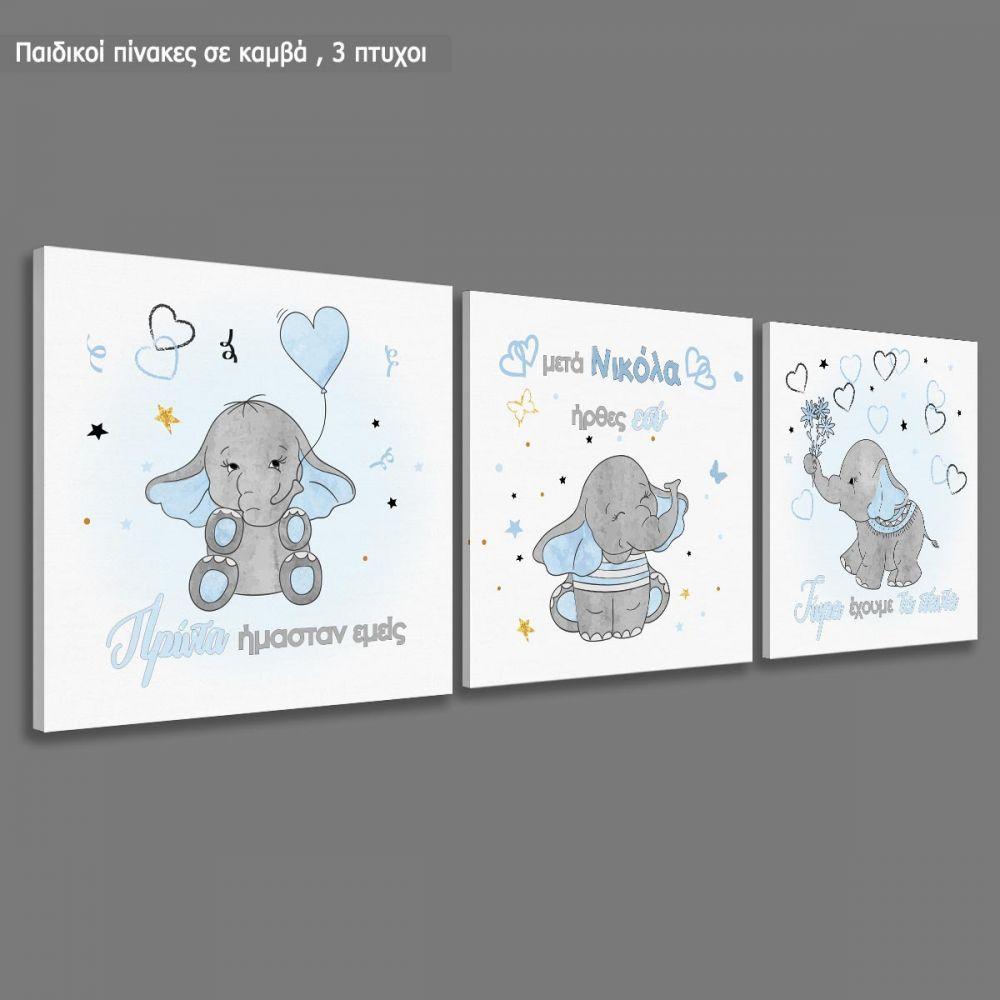 Πίνακας παιδικός σε καμβά Πρώτα ήμασταν εμείς, ελεφαντάκι, καρδιές και αστέρια, τρίπτυχος