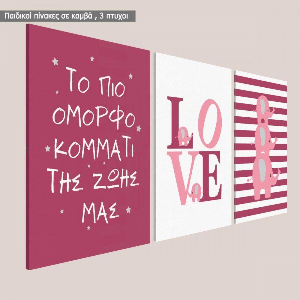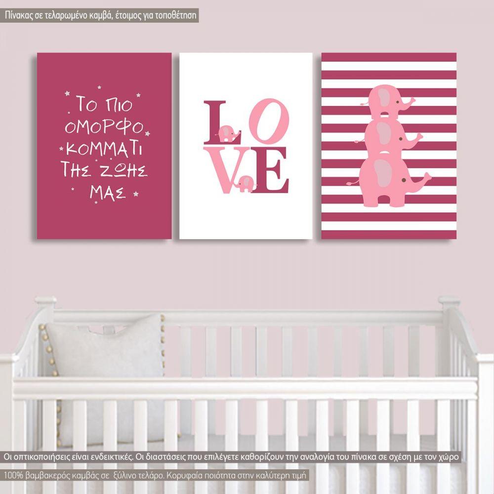 Πίνακας παιδικός σε καμβά Το πιο όμορφο κομμάτι της ζωής μας, χρώματα κορίτσι, με ελεφαντάκια, τρίπτυχος