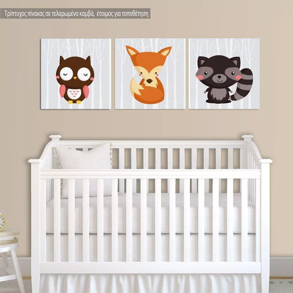 Πίνακας παιδικός σε καμβά Ζωάκια του Δάσους, σκιουράκι, λαγουδάκι και κάστορα, τρίπτυχος
