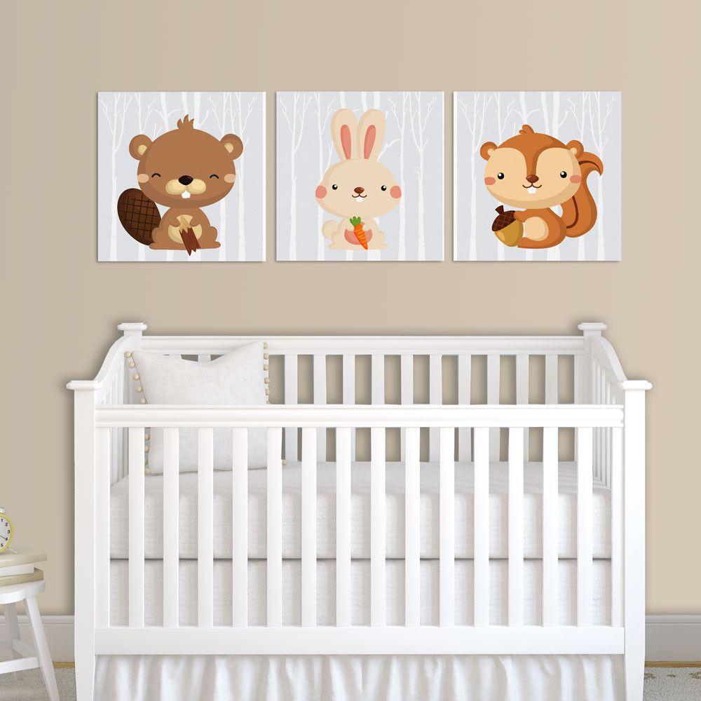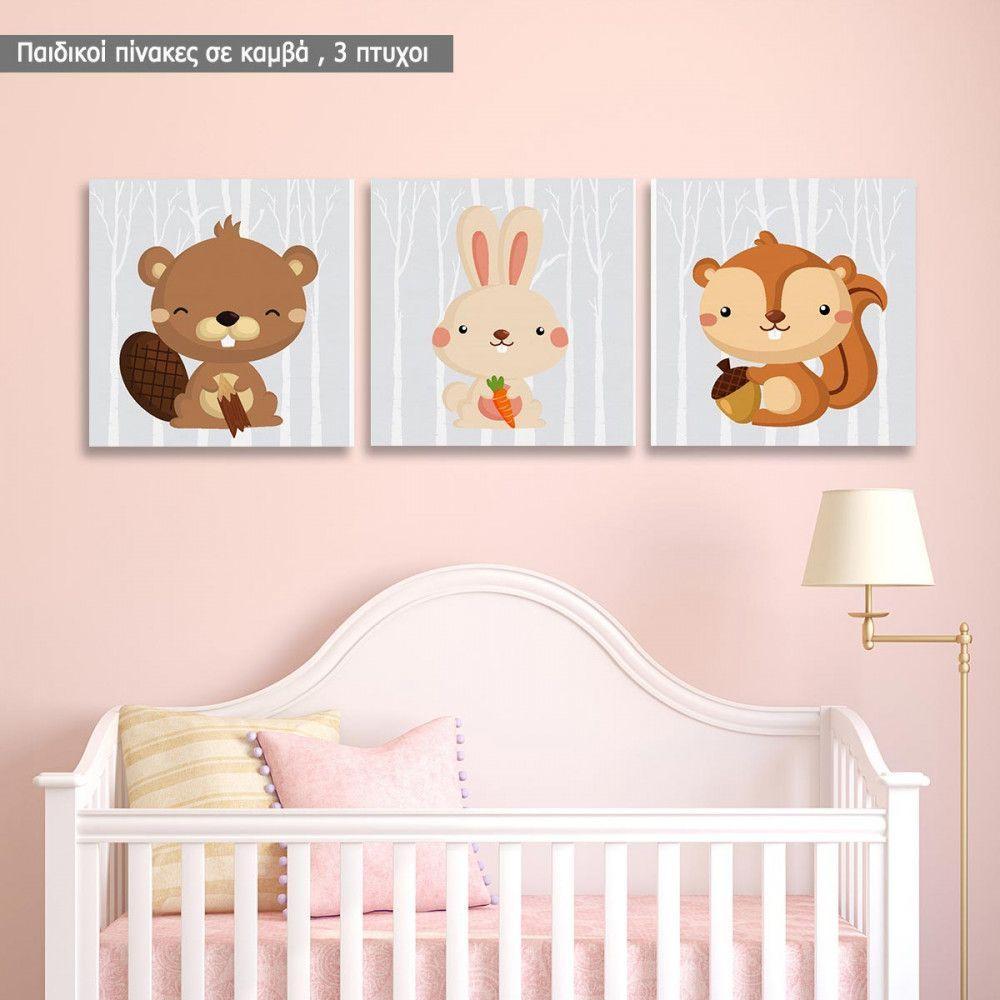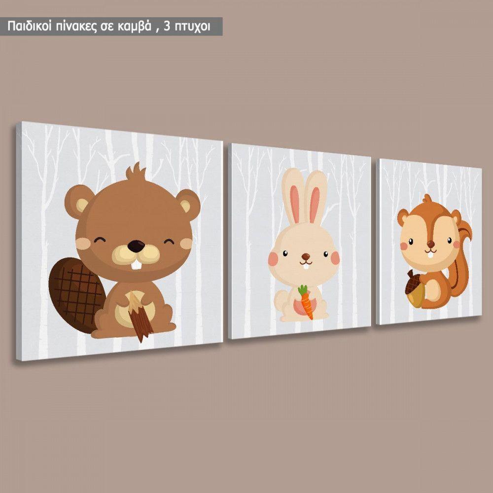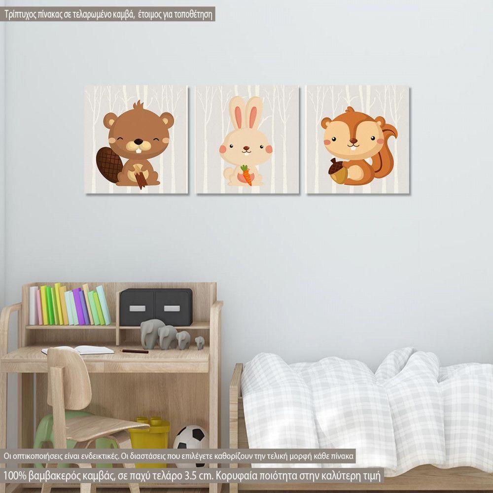 Πίνακας παιδικός σε καμβά Ζωάκια του Δάσους, σκιουράκι, λαγουδάκι και κάστορα, τρίπτυχος