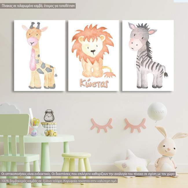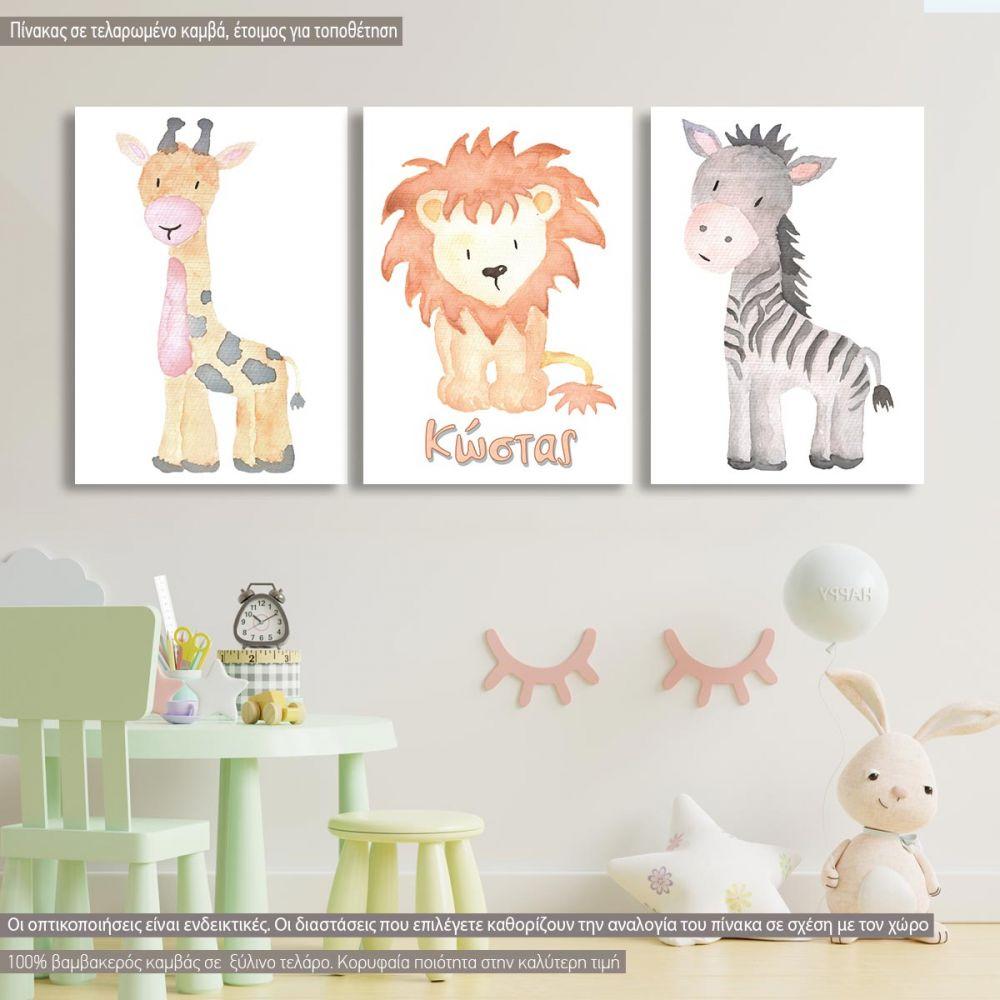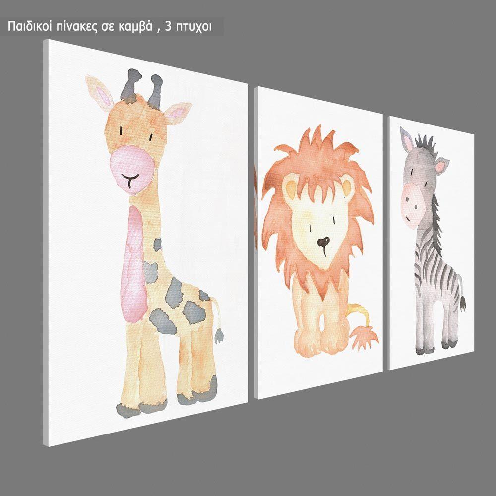 Πίνακας παιδικός σε καμβά Ζωάκια ζωγραφιστά, καμηλοπάρδαλη, λιοντάρι, ζέβρα, τρίπτυχος