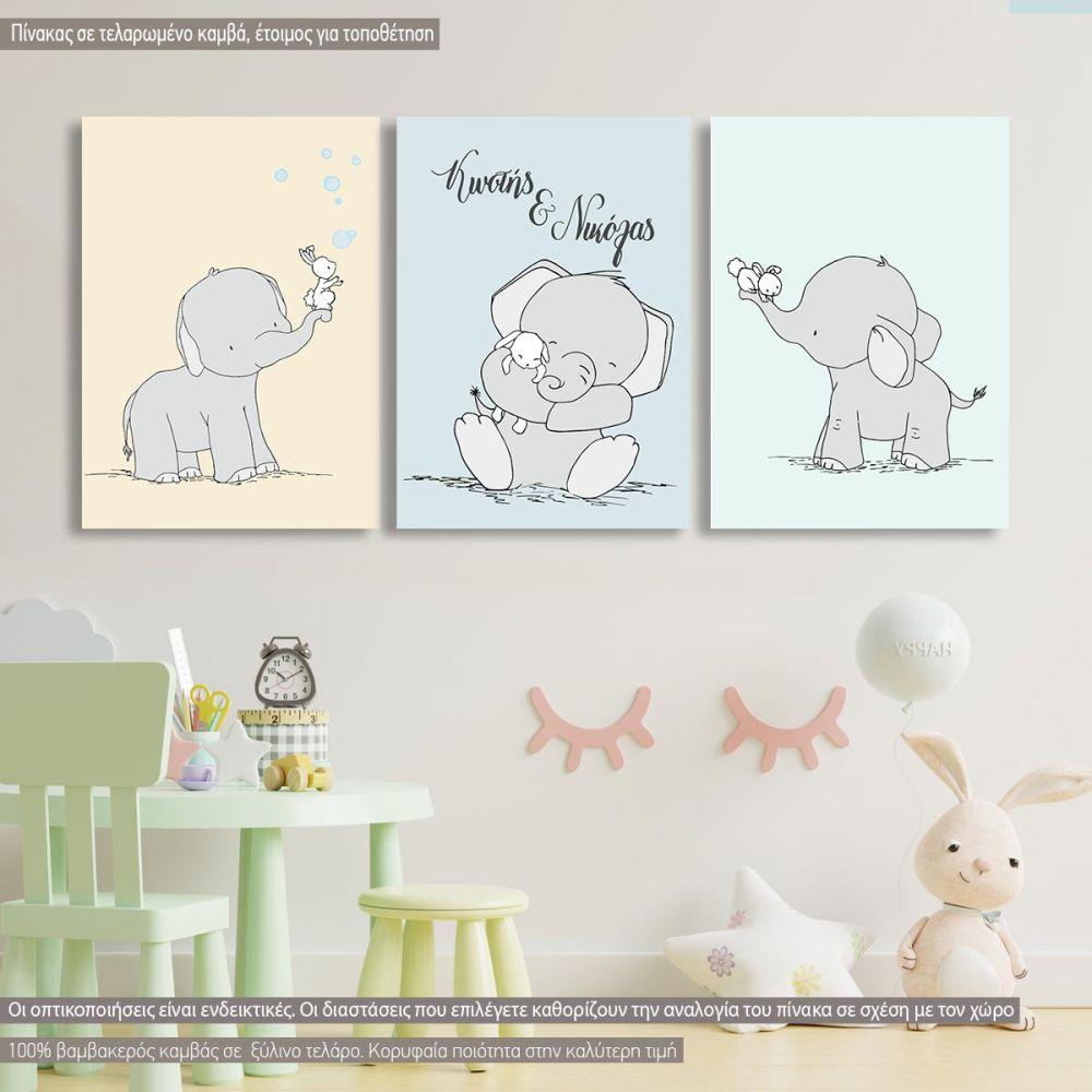 Πίνακας σε καμβά Αδερφάκια αγκαλίτσα, με ελεφαντάκι και κουνελάκι, τρίπτυχος