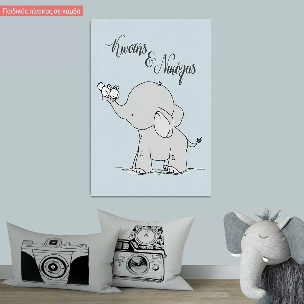 Πίνακας παιδικός σε καμβά Αδερφάκια τσουλήθρα, με ελεφαντάκι και κουνελάκι