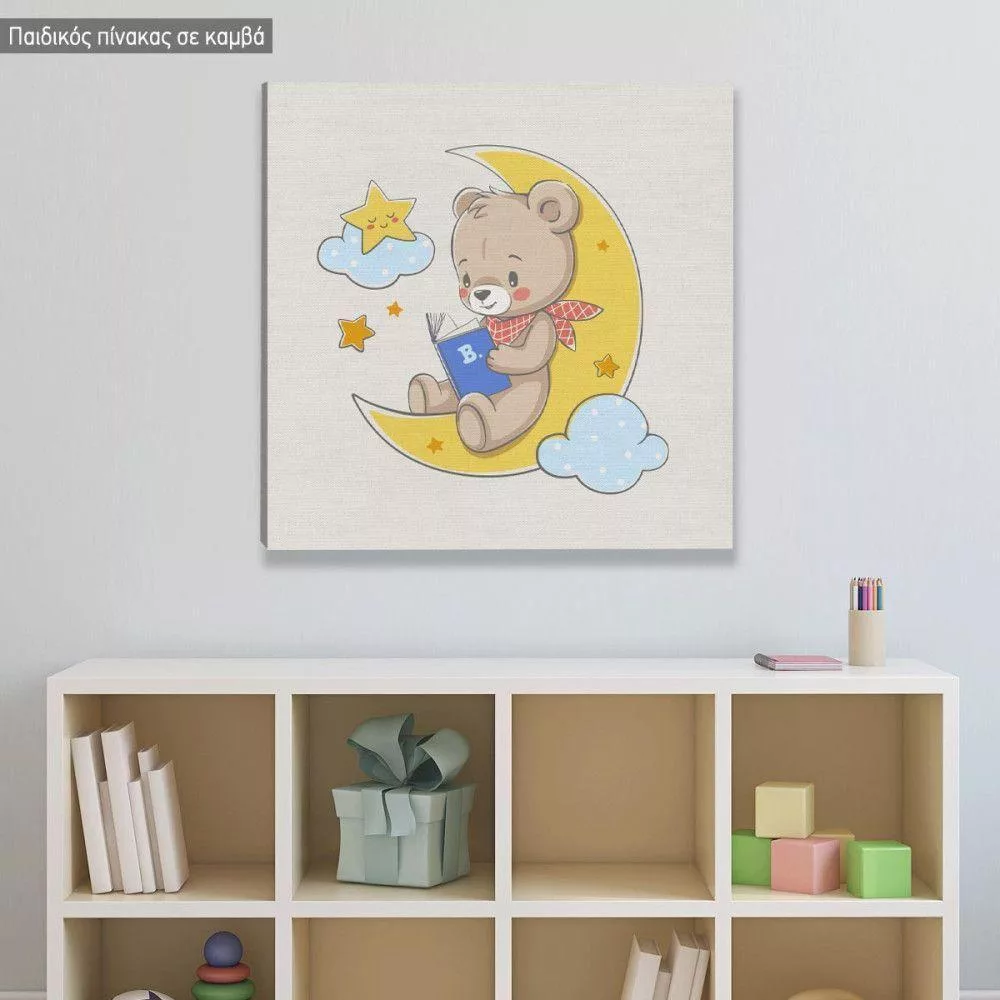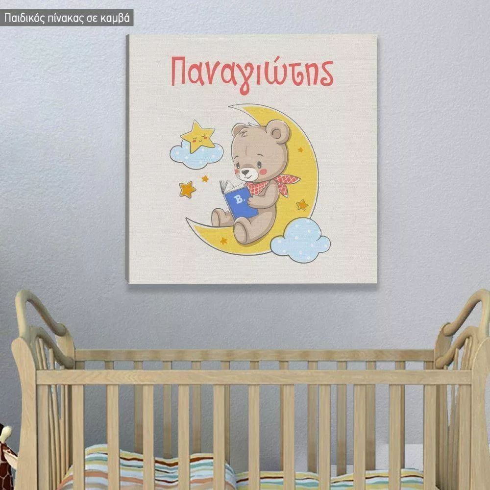 Πίνακας παιδικός σε καμβά Αρκουδάκι στο φεγγάρι και όνομα