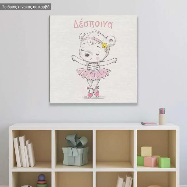 Πίνακας παιδικός σε καμβά Cute baby bear ballerina, αρκουδάκι μπαλαρίνα και όνομα