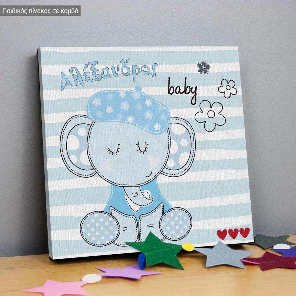 Πίνακας παιδικός σε καμβά Ελεφαντάκι baby boy, με όνομα