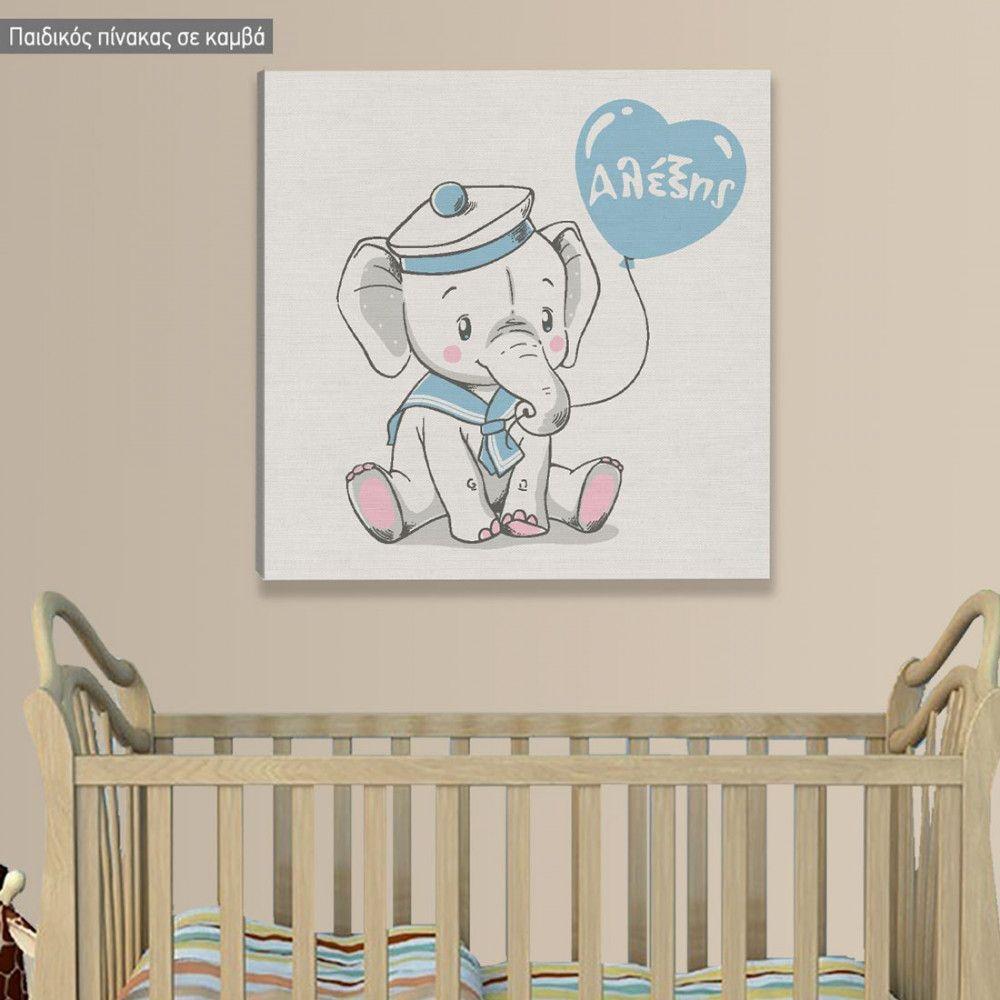 Πίνακας παιδικός σε καμβά Ελεφαντάκι ναυτάκι, μπαλόνι και όνομα