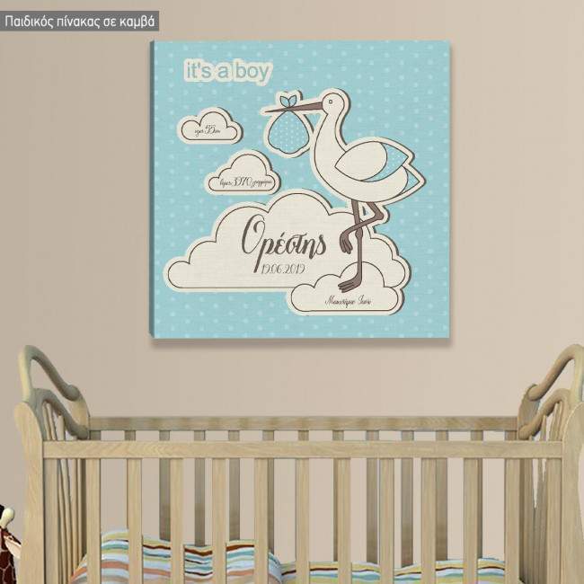 Πίνακας παιδικός σε καμβά Καλώς ήρθες αγοράκι μας, με στοιχεία γέννησης