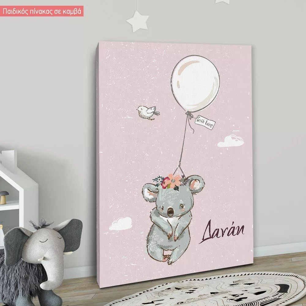 Πίνακας παιδικός σε καμβά κοάλα με μπαλόνια στα σύννεφα, με όνομα