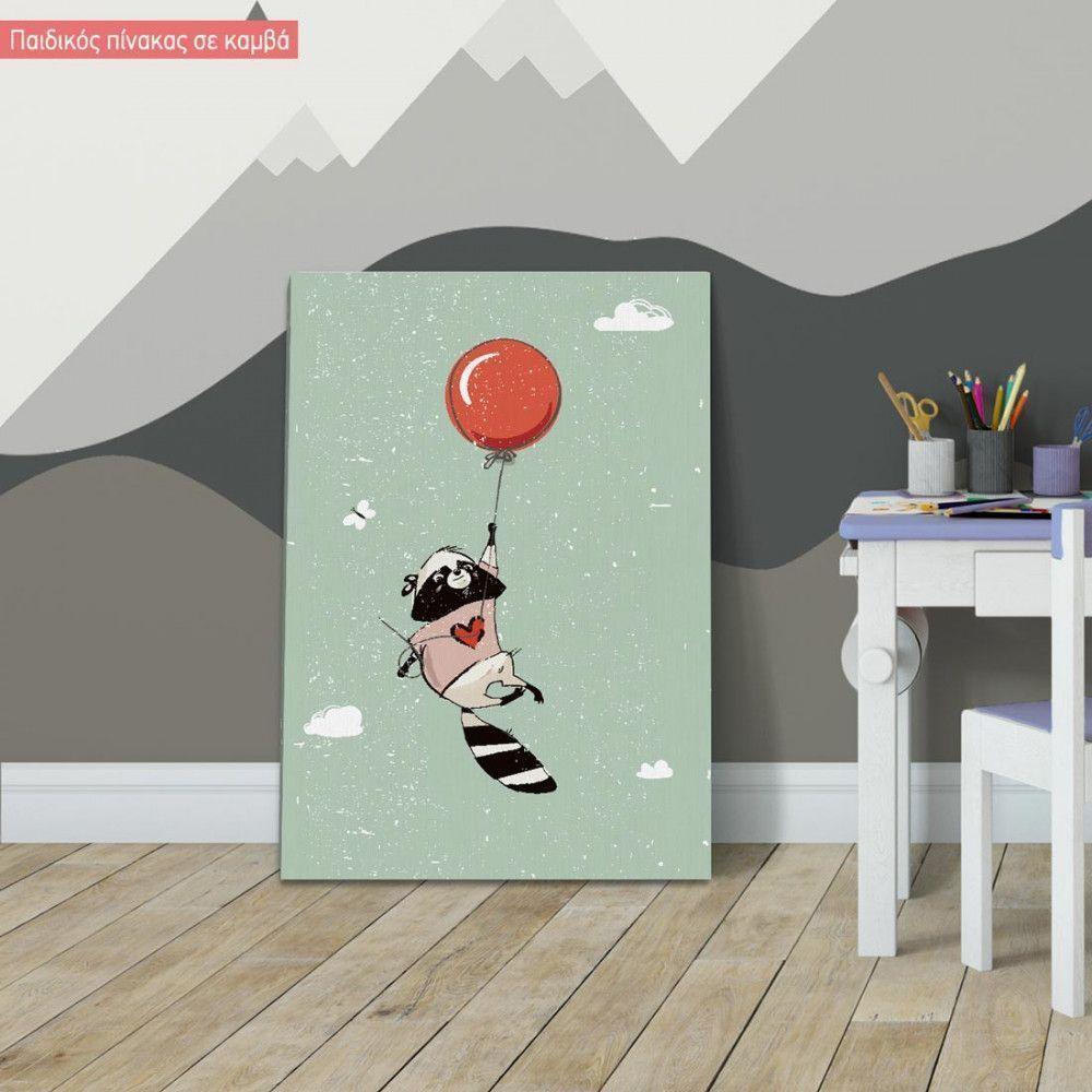 Πίνακας παιδικός σε καμβά ρακούν με μπαλόνια στα σύννεφα, με όνομα