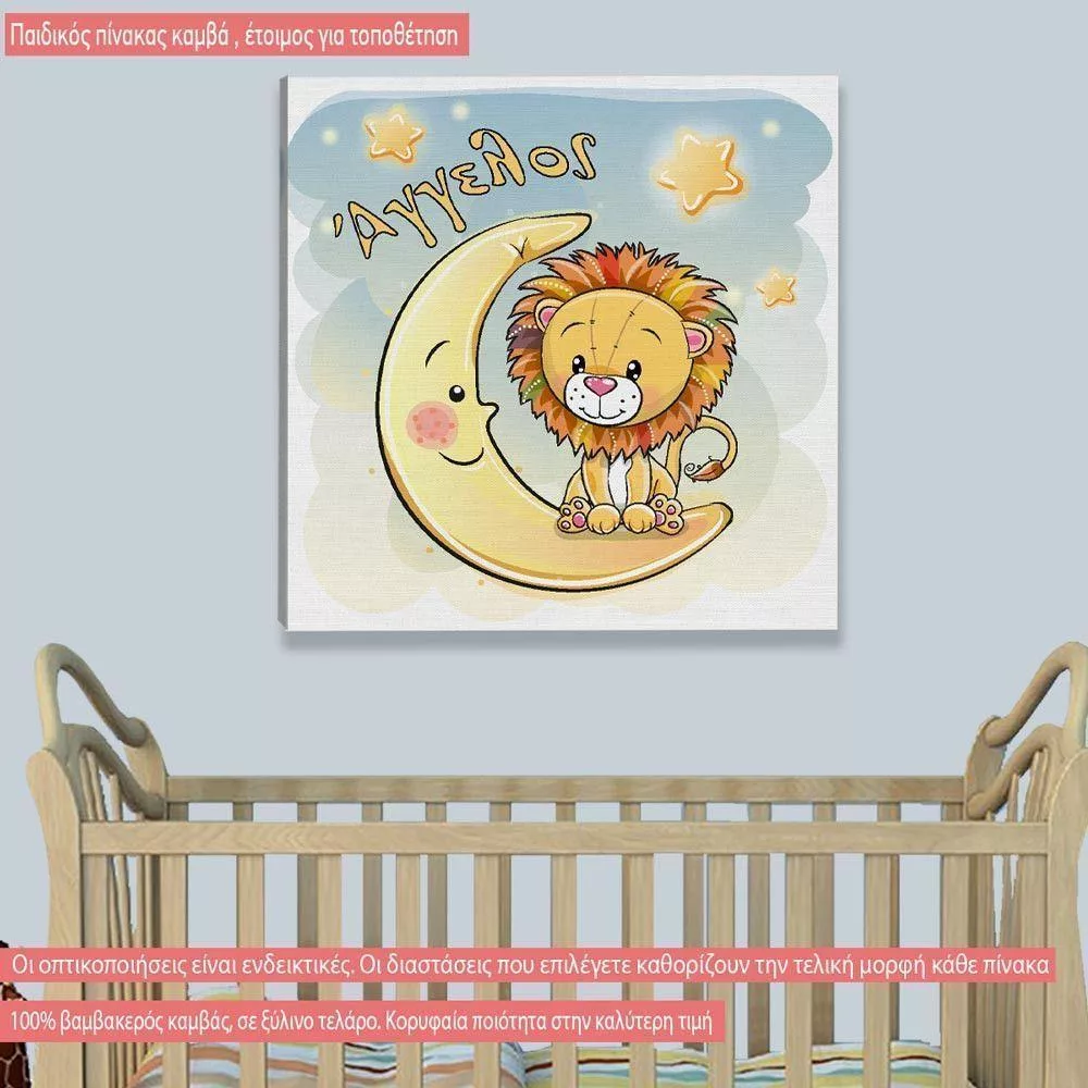 Πίνακας παιδικός σε καμβά Στο φεγγάρι, λιονταράκι, με αστεράκια και όνομα