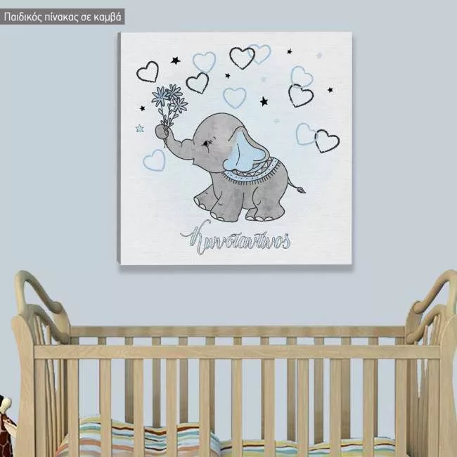 Πίνακας παιδικός σε καμβά Χαριτωμένο ελεφαντάκι με λουλούδια καρδιές και όνομα