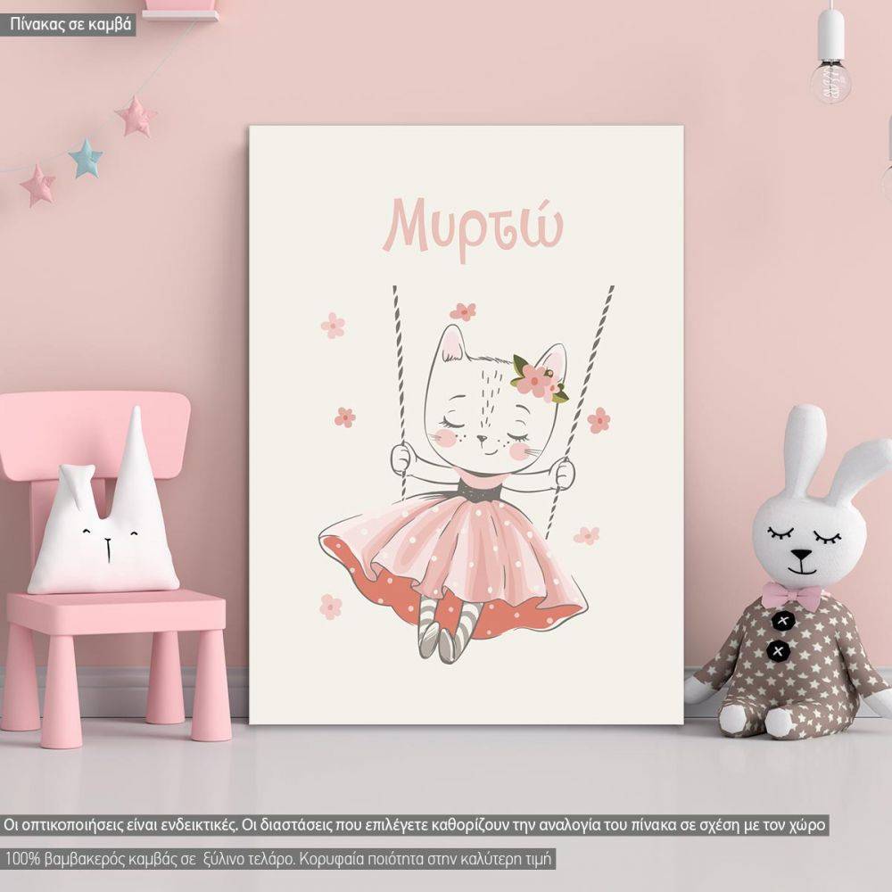 Πίνακας σε καμβά Γατάκι στην κούνια με όνομα, Kitty swing