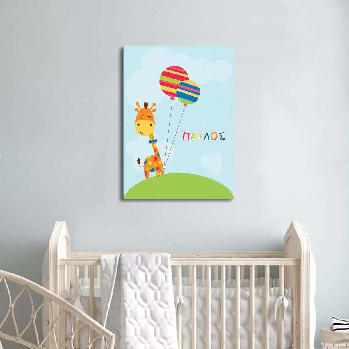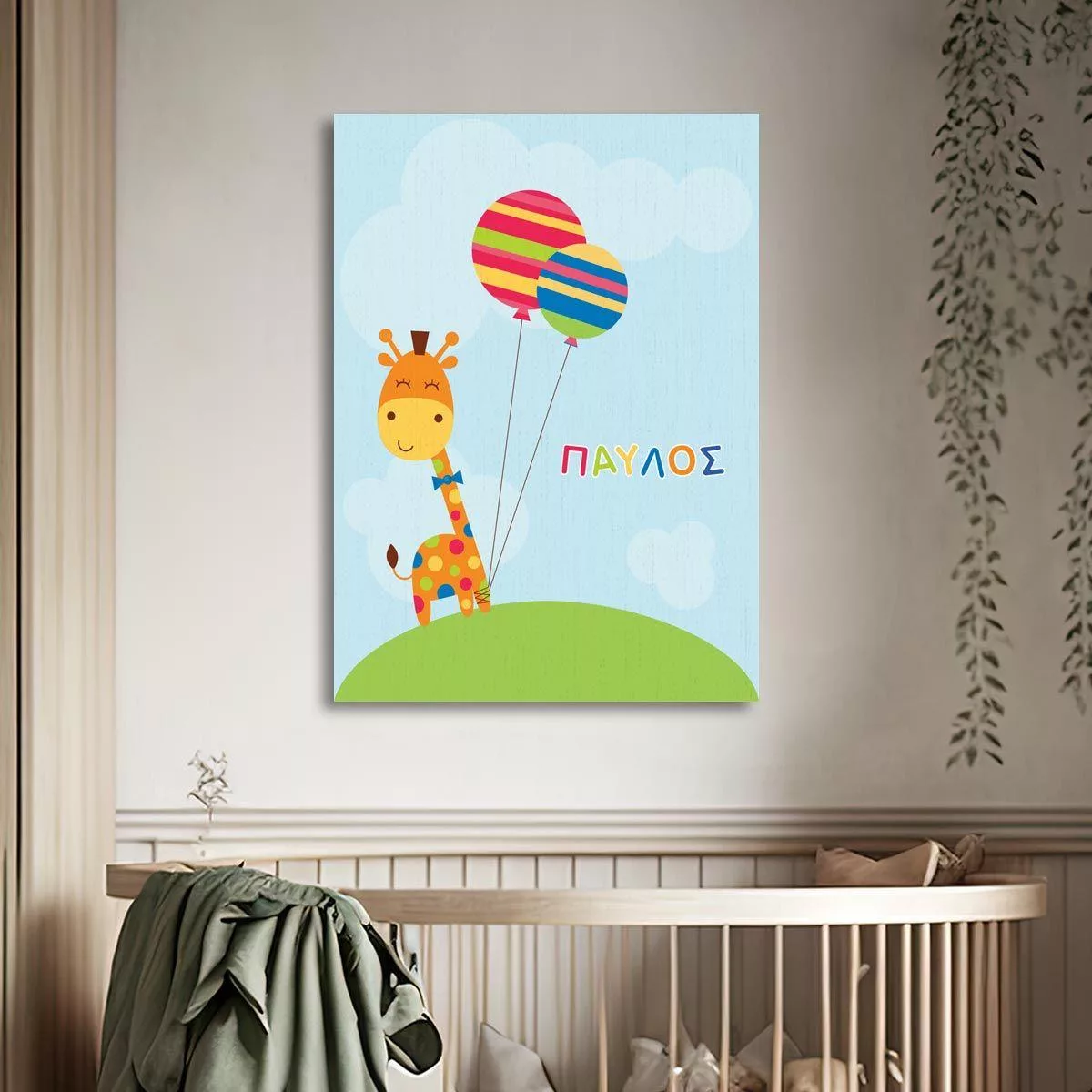 Πίνακας σε καμβά Καμηλοπάρδαλη με μπαλόνια και όνομα