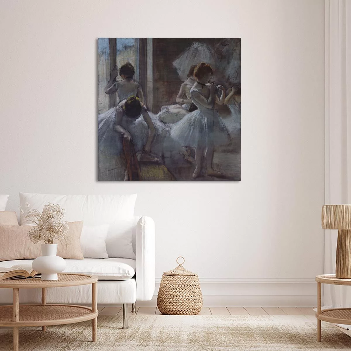 Αφήστε την έμπνευσή σας να χορέψει με το αριστούργημα "Dancers Preparing" (Προετοιμασία Χορευτριών) του Edgar Degas. Ως ένας από τους κορυφαίους οραματιστές του Ιμπρεσιονισμού, ο Degas αιχμαλώτισε αριστοτεχνικά τη μαγεία, την αυστηρή πειθαρχία και την αθέατη ρουτίνα του παρισινού μπαλέτου στα τέλη του 19ου αιώνα. Οι απαλές, γεμάτες συναίσθημα πινελιές του και η εξαιρετική χρήση του φωτός μετατρέπουν αυτήν την καθημερινή στιγμή στα παρασκήνια σε μια διαχρονική ωδή στην κίνηση και τη χάρη, προσδίδοντας καλλιτεχνική πνοή και κομψότητα σε κάθε χώρο.